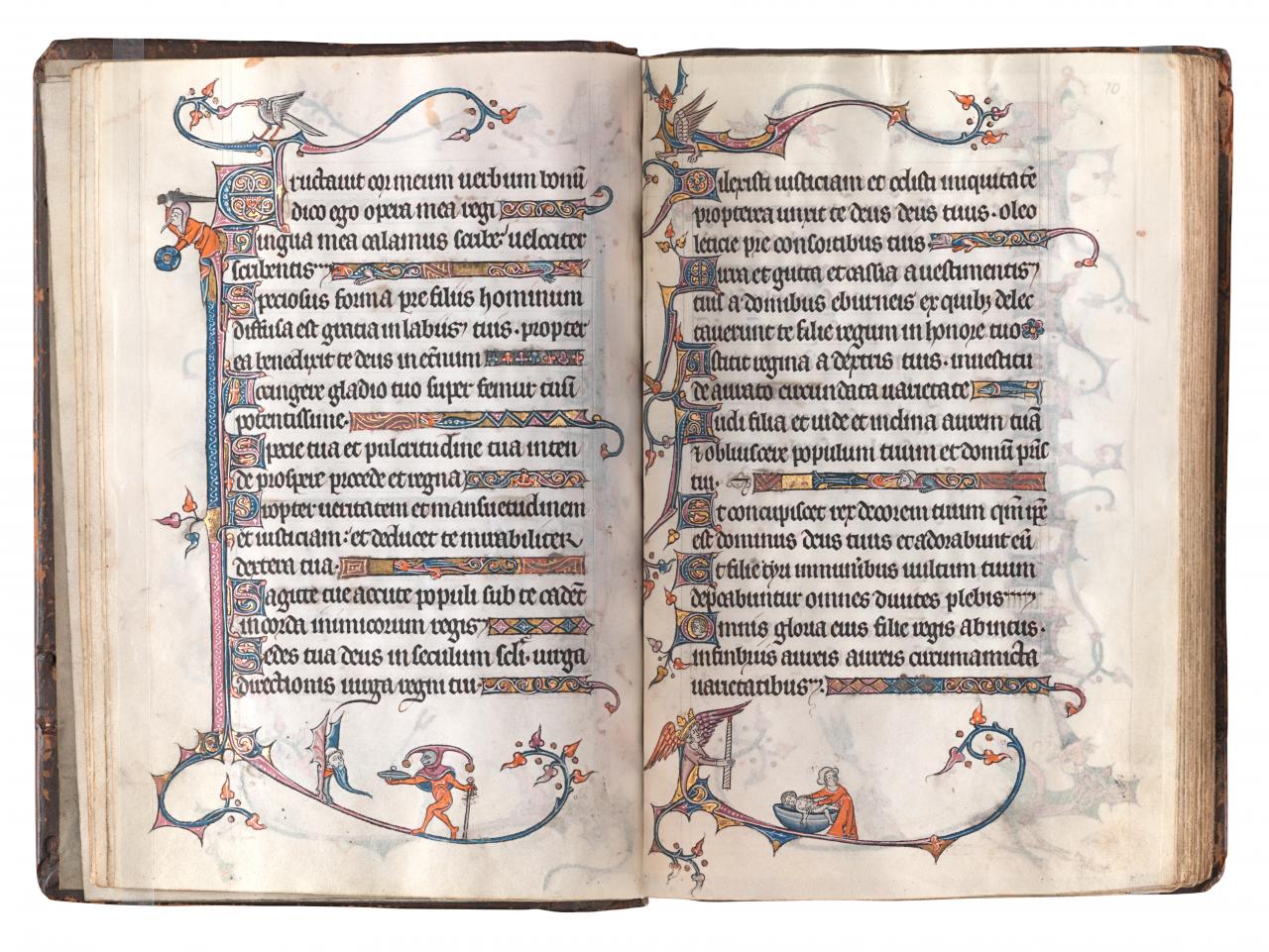 Subsequent gatherings, on the other hand, are characterised by heavier and darker line work and decorative initials, especially where the latter are concentrated along the left edge. Branched extensions are often awkwardly drawn and their curves flattened, and the border decoration becomes more extensive, threatening at times to engulf the text. Line endings, too, have more elaborate projections, and the sense of exaggeration is revealed also in the treatment of the figures in both the historiated initials and the marginalia, these often being rendered on a larger, somewhat disproportionate, scale. After gatherings one and two, moreover, the tonal contrasts used to model the draperies of the figures become more pronounced.