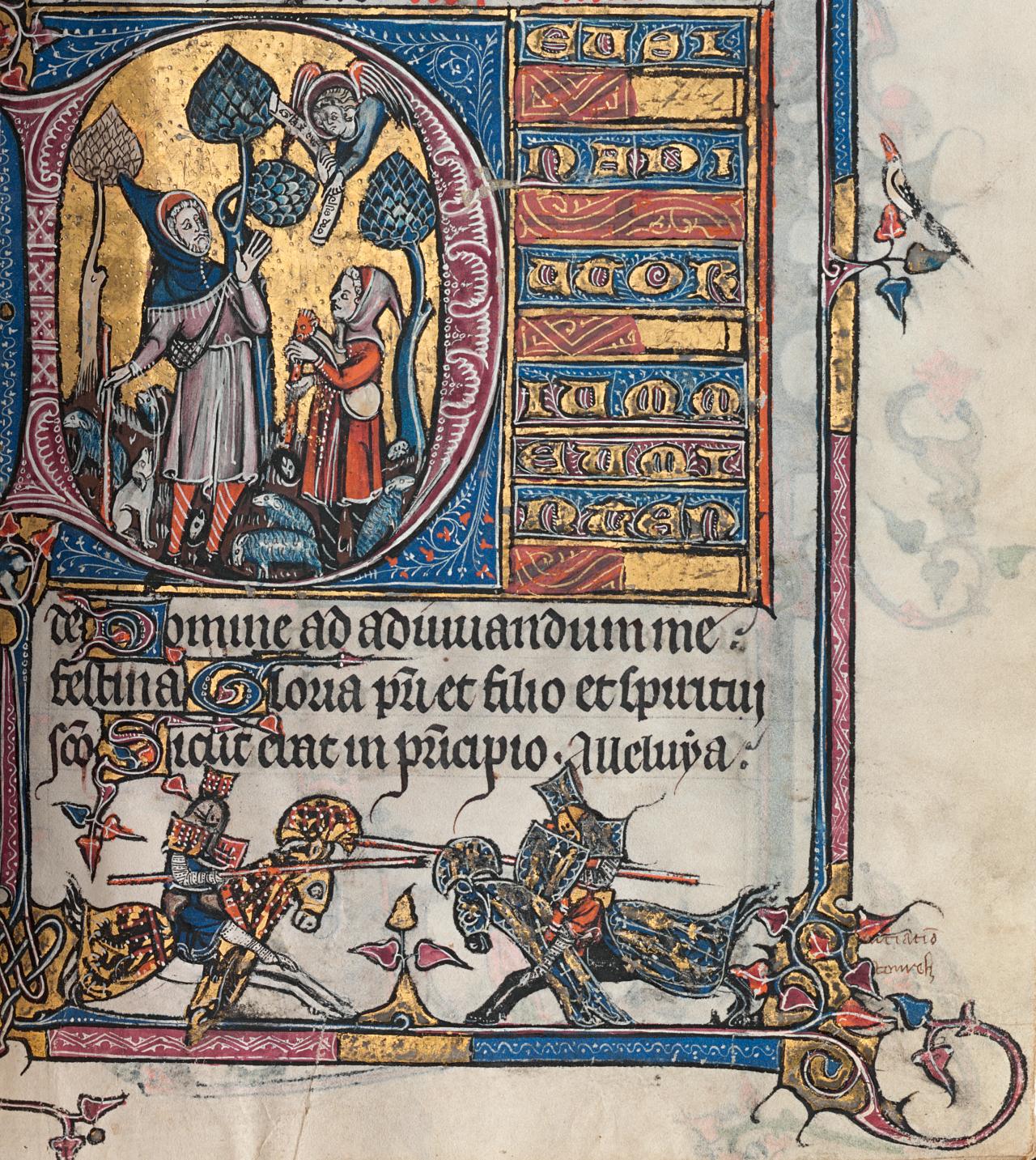 Another consistent decorative element, and one that occurs on almost every page, is the marginal figure, grotesque or drollery. Stylistically, these share the same features as the figures in the historiated initials, although, independent of any framing device and set against the neutral ground of the parchment (instead of the burnished gold or diapered backdrops of the initials), they evince more spontaneity and freedom of movement. Both kinds of figures reveal very little modelling or articulation of the faces and hands, while their drapery is modelled through line work, glazes or blended tones.