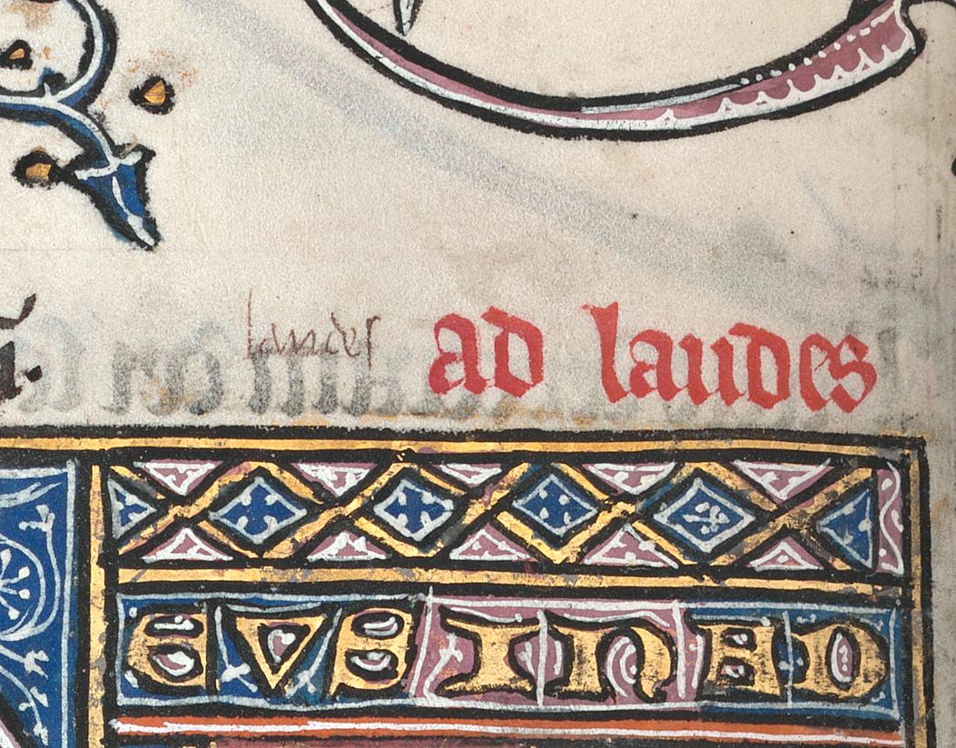 Nor is improvisation in the Aspremont Hours limited to the subject matter of the historiated initials. Breviary Offices are exceedingly complex, being full of interwoven texts – psalms, lessons, antiphons etc. and detailed rubrics. They are usually written in two columns and sometimes incorporate musical notation for responsories and hymns.15For breviary layout and decoration, see A. Hughes, Medieval Manuscripts for Mass and Office: A Guide to Their Organization and Terminology, Toronto, 1982, pp. 197–224. To transpose five full breviary Offices to a one-column format interspersed with devotional images was an exacting task, and that the approach of the scribe varied during the long project is abundantly clear. While some basic decisions were taken at the outset, such as the number of ruled lines per page, the treatment of the text otherwise evolved progressively after the first two gatherings, and the abbreviation of repetitive sections, as well as variations in page layout and in the presentation of rubrics, influenced the overall visual effect.