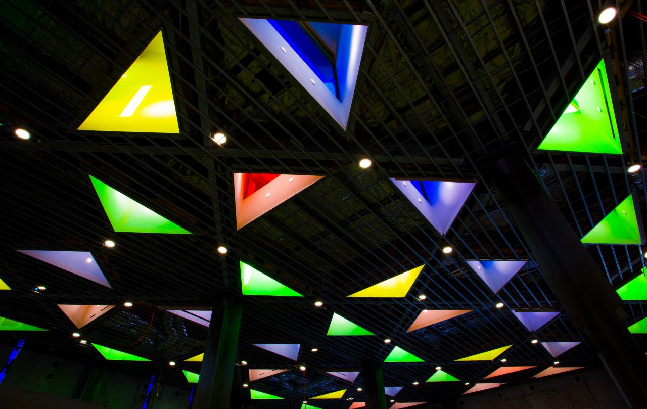 The home of the Prophet Muhammad, considered the first mosque, was a seventh-century Arabian-style house in Medina (now Saudi Arabia) with a large courtyard surrounded by long rooms supported by columns. Murcutt’s design for the Australian Islamic Centre arranges twenty-four steel columns to create three bays from east to west and three from north to south, reflecting traditional mosque geometry. A reflective water courtyard to the west and fifty-five three-metre high roof-mounted lanterns naturally illuminate the main prayer hall. Glazed in colours symbolic to Islam (yellow, green, blue and red), these lanterns face the four points of the compass, drawing triangles of coloured daylight into the building in an ever-changing pattern determined by the sun’s movement.