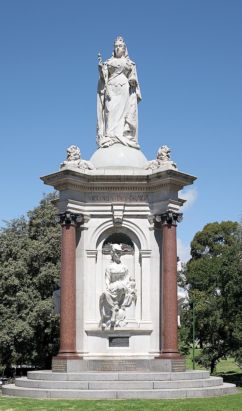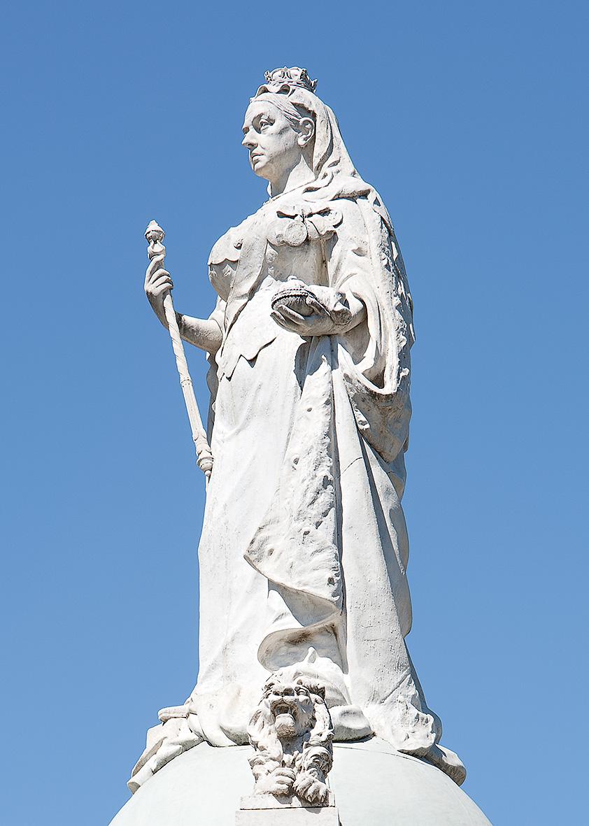 The marble statue of the queen was 4.5 metres high, raised up on a substantial architectural plinth, with niches containing large allegorical figures, also carved in white marble, of Progress, Wisdom, History and Justice, each armed with appropriate attributes. The total height of the statue and base was over thirteen metres, making it the largest and most ambitious Victoria memorial in Australia.