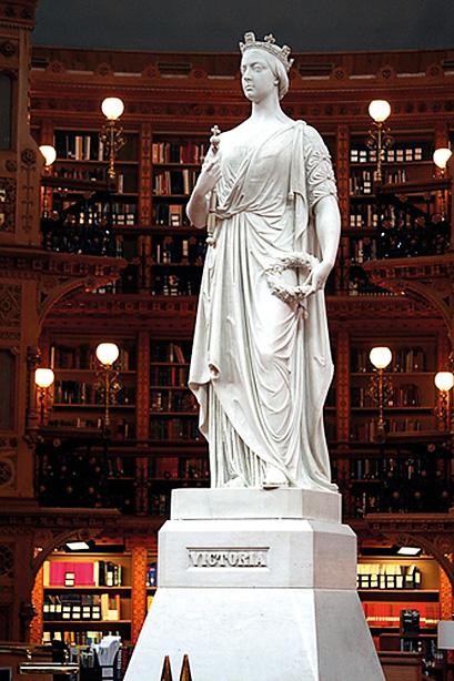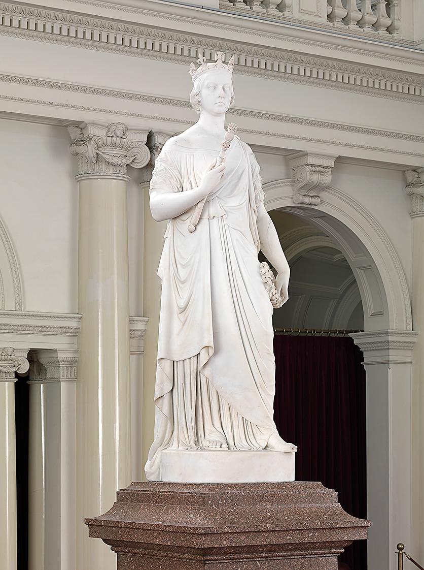 It has perhaps been forgotten that when the four statues by Summers arrived at the NGV in 1878, there was already another monumental marble statue of the queen prominently displayed in the Public Library/ NGV building: Marshall Wood’s full-length figure which today dominates the Queen’s Hall at Parliament House (fig. 5). Queen Victoria is depicted wearing overtly classical dress (reflecting, for example, Gibson’s classicising Queen Victoria statue of 1844–47);19Royal Collection; see Marsden, pp. 72–3. she wears the Regal Circlet,20After Albert’s death in December 1861, Queen Victoria never again wore the Regal Circlet. Information kindly provided by Jane Roberts. and holds a sceptre and the laurel wreath of victory (Victoria). The statue is dated 1876 and is recorded as being on public view in 1877. It should be noted that Wood’s public presentation of the statue in Melbourne was speculative. The Argus reported in August 1877 that it was under consideration and ‘will probably be secured by the Government, to be erected in the centre of the new hall now in course of construction in connexion with the Parliament-house’; by November the Sydney Morning Herald reported that it had been purchased by the Victorian Government for 3000 guineas.21Sydney Morning Herald, 2 November 1877, p. 5.