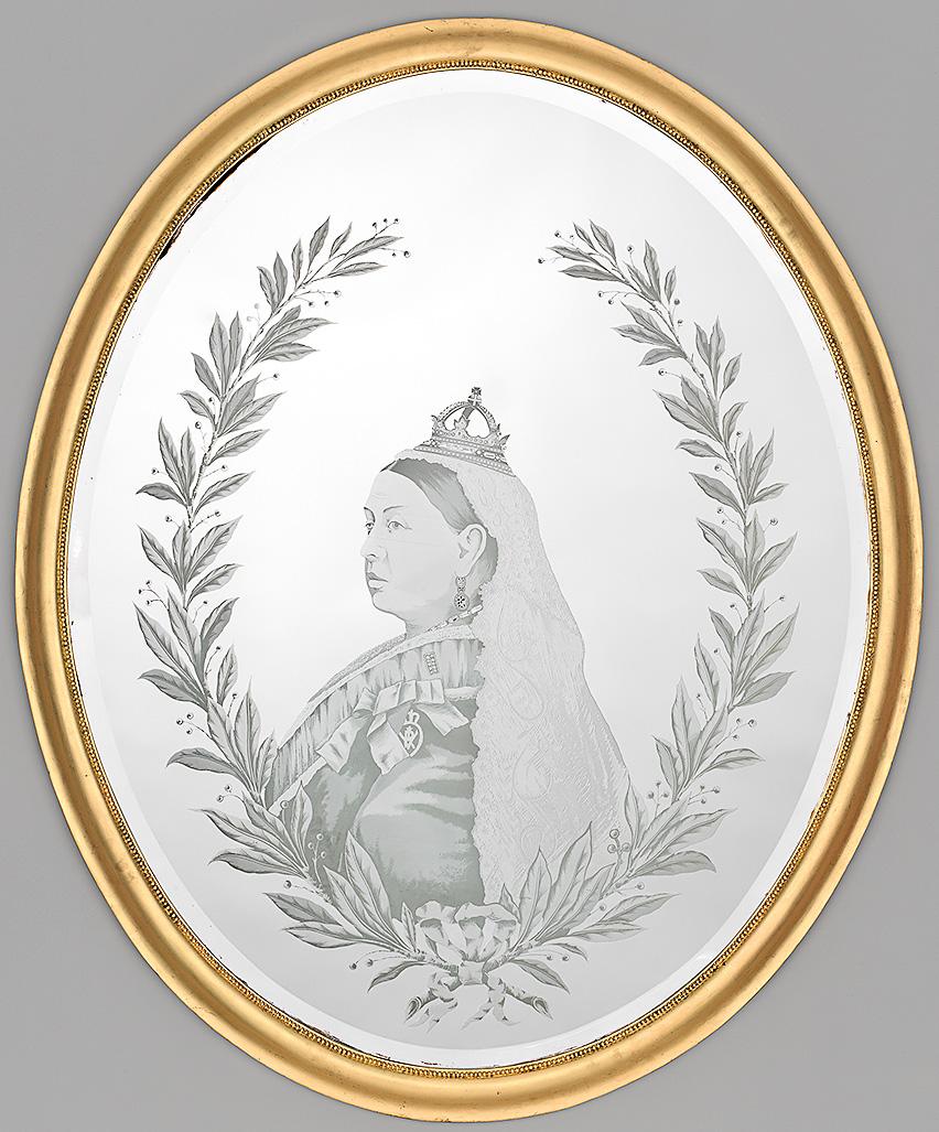 Queen Victoria lent one major work from the Royal Collection, J. Phillip’s Marriage of the Princess Royal (fig. 12) and the Parliament of Victoria lent the two copies of Winterhalter’s 1843 portraits. In common with the rest of the Empire, Melbourne was awash with Diamond Jubilee memorabilia, with the Fisher Brother’s elaborately etched giltwood oval mirror, with its portrait of the queen,39NGV, acquired 1997. The mirror descended through the Fisher family, but there is an oral tradition within the family that the mirror had been hung at Parliament House and later returned to the family – presumably when Victoriana became unfashionable. The Fisher Brothers first appear in trade directories in Melbourne in the late 1890s, and it can be presumed that this was a particularly glamorous production made specifically for the Jubilee. a particularly elaborate example (fig. 13).