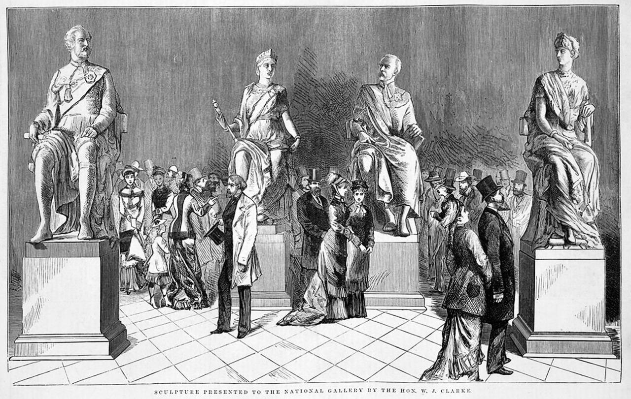 Gentlemen – it is my privilege to present to the National Gallery the statues in this chamber of Her Majesty the Queen, His Royal Highness the late Prince Consort, and their Royal Highnesses the Prince and Princess of Wales. I would be wanting in feeling if I did not refer to the talented artist who created these figures, and who unfortunately died while he was on his way to place them with his own hand within this gallery (cheers).