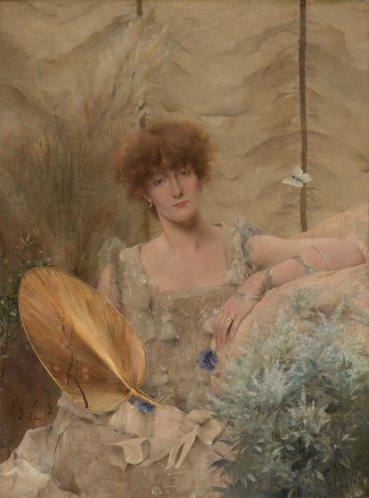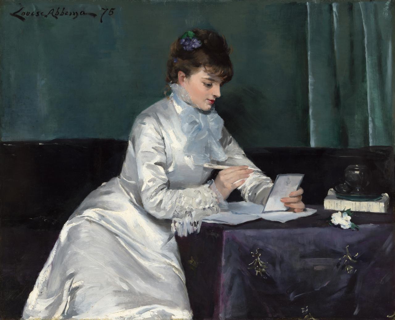 In 1875, around the time the two met, Abbéma painted an exquisite portrait of Renée Delmas de Pont-Jest, which has been gifted to the NGV by Krystyna Campbell-Pretty AM and Family through the Australian Government’s Cultural Gifts Program. Born in 1858, and thus around seventeen when depicted in the work, Delmas is shown seated at a desk in a shimmering satin gown, holding a sheet of black-bordered mourning stationery. Delmas was the daughter of the celebrated former naval officer, writer and journalist Louis-René Delmas de Pont-Jest. Renée’s son, in later years, described how his grandfather used to give masked balls four times a season in his house on the rue Condorcet. Everybody who was anybody in Paris crowded to them. In the course of the evening Christine Nilsson would sing, Sarah Bernhardt would enchant, [Gaston] Serpette would be at the piano, [Jean] Mounet-Sully would read verse, and Coquelin Cadet the younger would recite his first monologues.7Sacha Guitry, If Memory Serves, trans. Lewis Galantière, Doubleday, Doran & Co., New York, 1936, pp. 6–7.