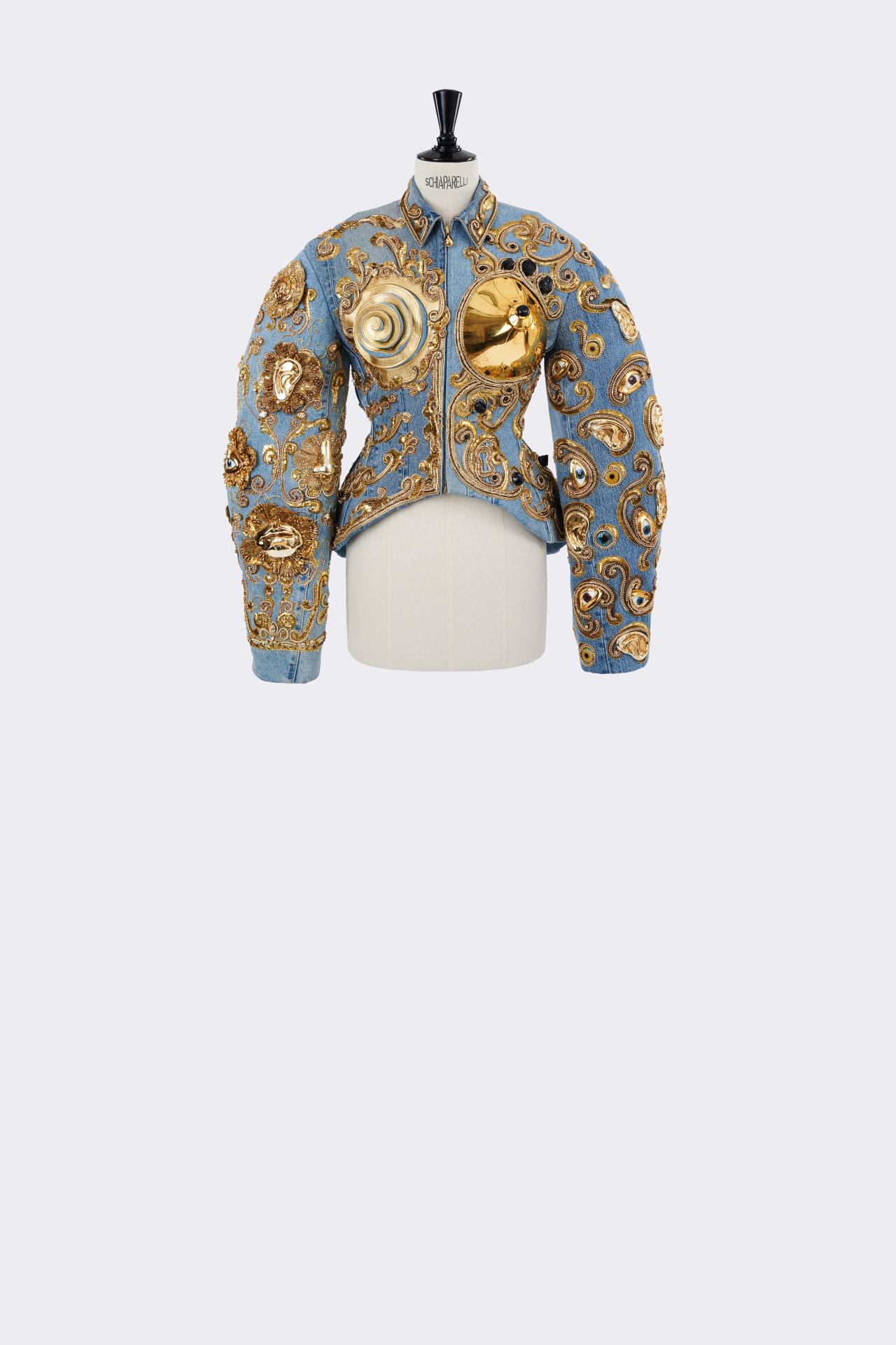 By stepping up to the plate and approaching the founder’s ideas with such gusto, Roseberry unlocked a new universality in the work that was previously lacking, moving the conversation away from the subtle romance so often associated with the rarefied world of haute couture towards a bolder vision. In doing so, he successfully provoked the sense of wonderment that comes from, say, a shocking pink velvet gown that hangs not from the wearer’s shoulders, but from a pair of gold doorknocker earrings, or a denim jacket bedazzled with filigree embroideries of eyes and ears, replete with a mismatched pair of perky gilded breasts. ‘The Matador collection was designed with a child’s viewpoint in mind’, says Roseberry, referring to the autumn–winter 2021–22 haute couture collection that also included a black dress with a circular sleeve pattern festooned with 3D silk roses, inspired by an evening coat Schiaparelli designed with Cocteau. He elaborates: