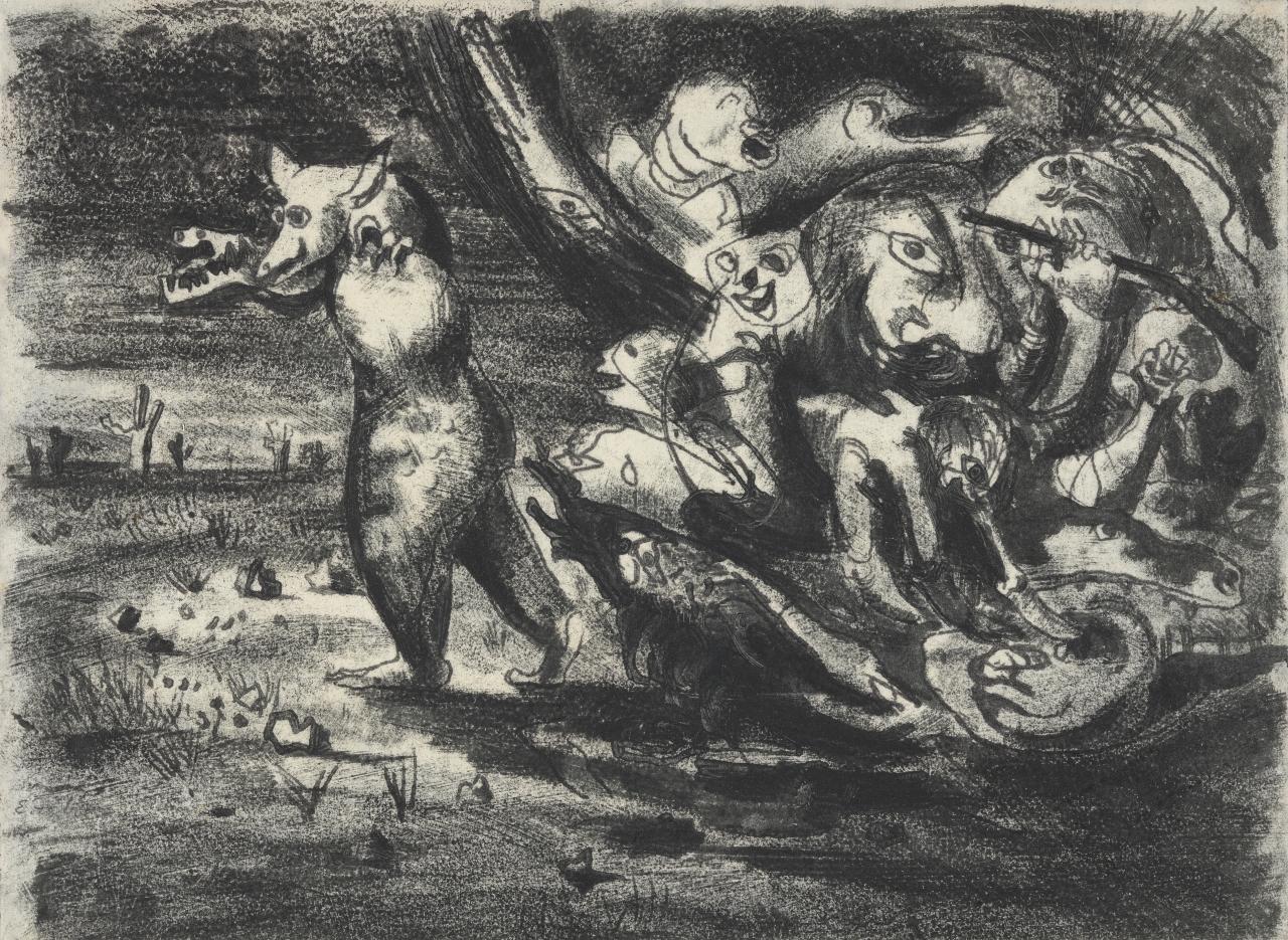 The barren environment of the outback could not have been more different from the familiar European landscape. For fellow internee Erwin Fabian, its otherworldly qualities were both disorienting and surreal. Fabian was born into an artistic family in Berlin – his father Max Fabian was a professional artist and, although Erwin had little training, he was a skilled draughtsman and, prior to his deportation to Australia, had worked as a graphic designer in England. During his internment, Fabian produced numerous drawings, watercolours and prints. Many of these depict the daily routine of the internees, and some are imagined scenes that reflect the psychological trauma of persecution and war. The horrific voyage onboard the Dunera, the isolation, heat and dust storms in the camps, and thoughts of the war back home are reflected in works like Beast-like creature leading a group of anthropomorphic figures, 1941, which shows a nocturnal procession of monstrous creatures. Caught in a mass of struggling heads and limbs, the profile of a giant bearded man can be distinguished in the centre of the crowd; to his right, two arms are clutching a rifle. The group is led through a barren landscape by a clawed figure, accompanied by a bird-like animal reminiscent of Hieronymus Bosch’s fantastical creatures.