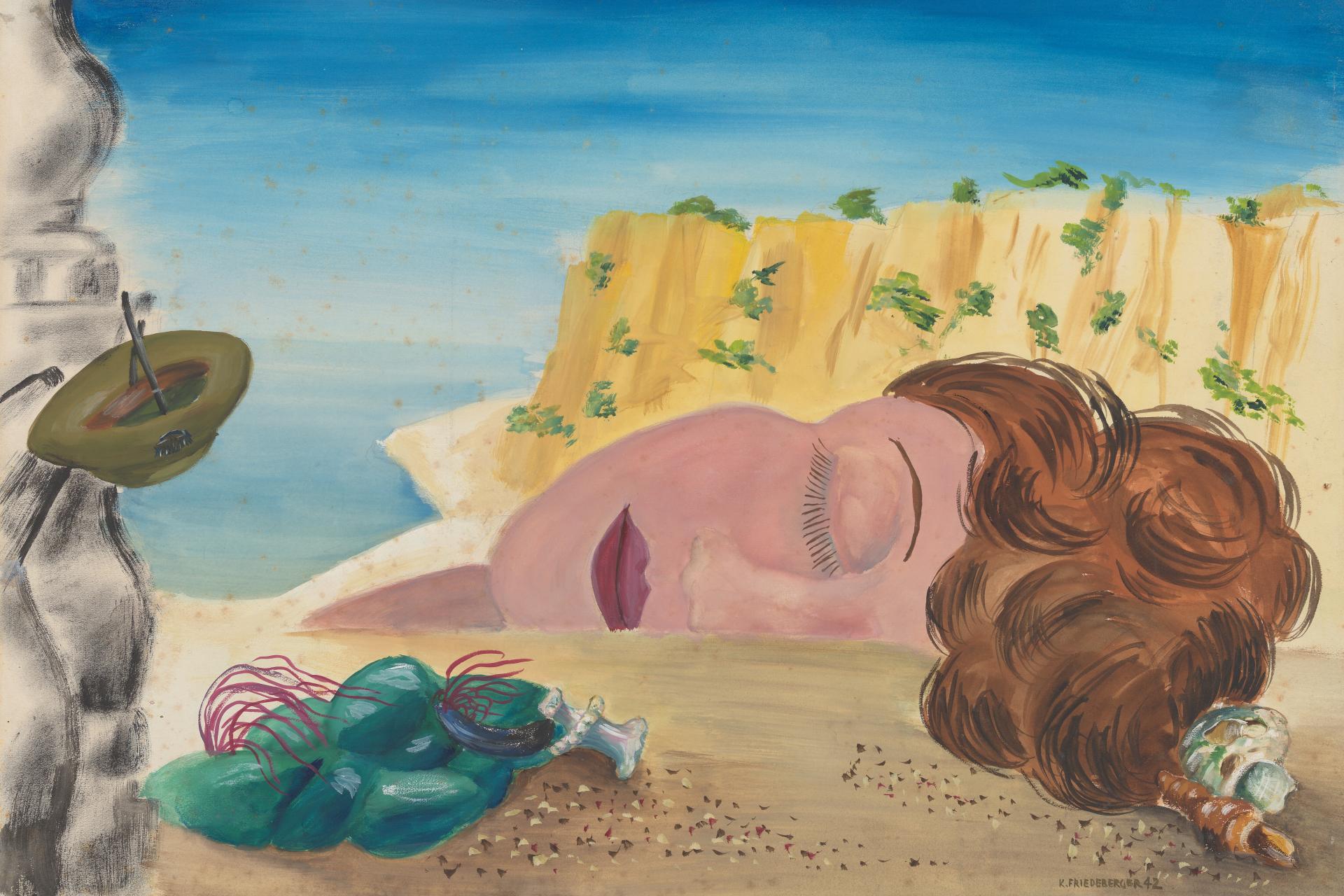 For most detainees, the internment lasted around eighteen months. By the end of 1941, many men were released and repatriated to England after having their cases assessed. In early 1942 those who were thought to pose no risk could also volunteer for the Australian Army’s Labour Corps. Both Fabian and Friedeberger chose this option and were briefly stationed in Tocumwal on the border of New South Wales and Victoria. Two gouache paintings in the NGV Collection were made during this period: Fabian’s Surrealist work, Sleep, 1942, showing five men asleep in a desolate surreal landscape, and Friedeberger’s Black Rock, 1942, which depicts a gigantic sleeping head lying on its side at Black Rock Beach. Friedeberger would have painted the gouache during one of his weekend visits to Melbourne while on leave from duty – his army hat can be seen hanging from the edge of a rock on the left.