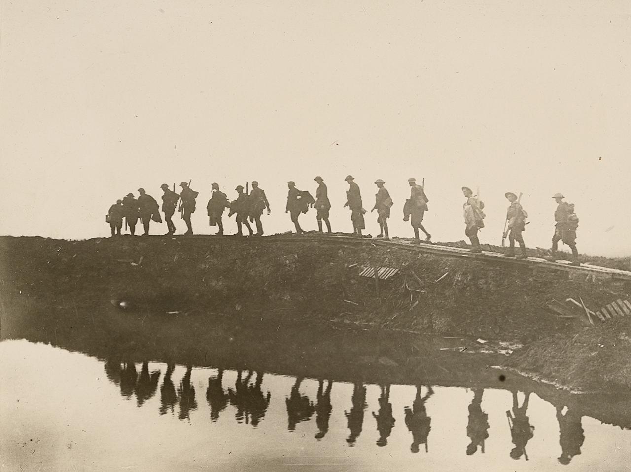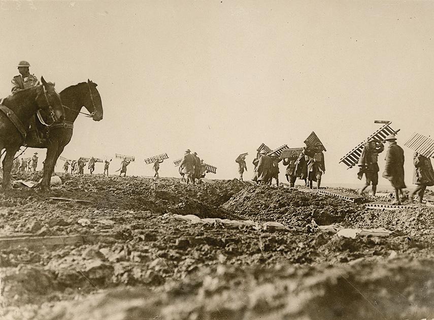 To facilitate movement to and from the front across this hazardous terrain, troops spent hours laying duckboard tracks. The laborious nature of this task is shown in Hurley’s photograph Pioneers of the 1st Australian Division preparing a duckboard track, 1919 (fig. 3). In this image Hurley shows a stream of men moving across the landscape, diminutive figures stretching from one side of the photograph to the other. The men heading out are weighed down with sections of the timber walkways that were laid on the mud to enable safer passage across the treacherous ground. The returning soldiers appear to march resolutely back to collect the next section of duckboard.