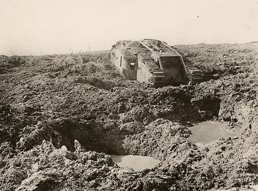 Fought in dreadful conditions, the First World War saw the introduction of a range of new war machines. One of the photographs in the NGV group, for example, shows a disabled tank in the mud (fig. 2). A product of the mechanical age, tanks, or ‘land ships’ as they were also known, were first seen in the 1914–18 war, although their deadly effect was clearly defeated by the mud of Flanders. Hurley wrote at length in his diaries about fighting and living conditions in and around the battlefields, and in this image he gives a clear sense of the impassable nature of the broken and saturated ground.