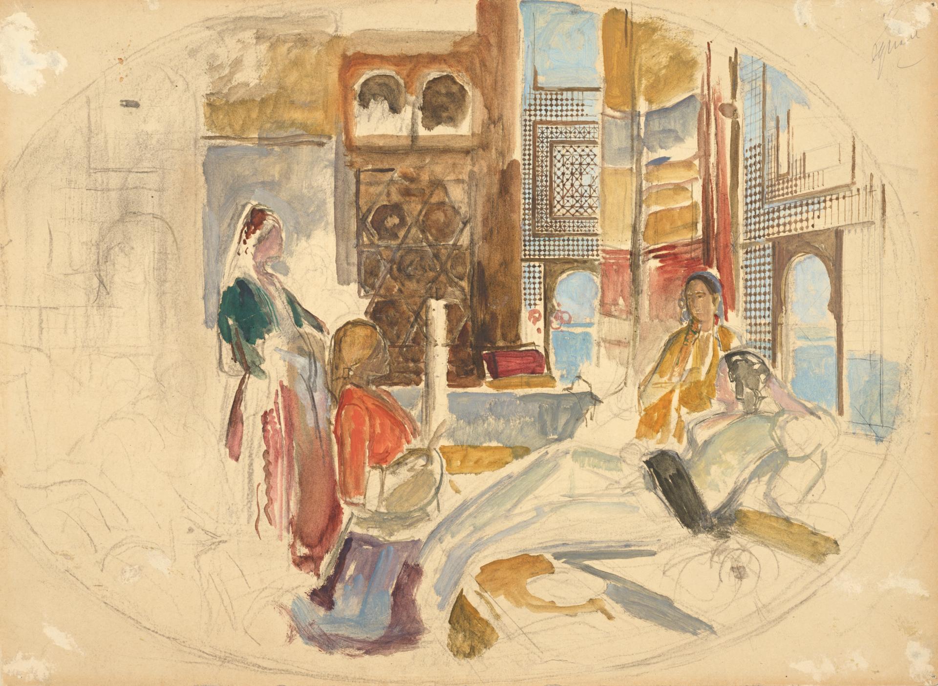 This drawing, of course, represents the very antithesis of the concept and treatment of the artist’s famous and highly-prized watercolours of his orientalising period dating from 1850 until the year of his death, renowned for their accumulation of meticulous, circumstantial Islamic detail and the painstakingly intricate elaboration of texture in extensive bodycolour, further enriched with a full panoply of Indian ink, Chinese white, gum arabic and scraped heightening. Yet aesthetically and stylistically atypical as it may appear in general context, the sheet seems to be of some rarity and considerable procedural interest, as one of the very few direct compositional studies to have been preserved from the opulent ultima maniera of this most conscientiously craftsmanly and flamboyantly sumptuous of the British orientalists.