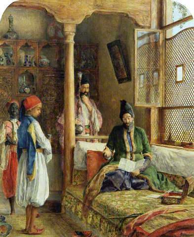 Writing in 1865 of A Turkish school in the vicinity of Cairo, Egypt38Lewis, 1978, cat. no. 595. the Athenaeum of 6 May found the work was treated with breadth but the figures were lacking in substance, ‘their execution is rather thin’ (Lewis had used an old drawing for the dominant bearded pedagogue), an opinion shared by The Times in its more appreciative notice concentrating on a ‘new quality … in its breadth and unity of effect, till now imperfectly attained by this most minutely elaborating painter!’39The Times, 29 April 1865. The writer in the Art-Journal, in linking the picture with In the Bey’s Garden, Asia minor (Harris Art Gallery, Preston)40Lewis, 1978, cat. no. 598, illus. fig. 59; a replica is recorded (Witt Library, London) as having been in the possession of the Maharaja Gaekwar of Baroda in 1920. pin-pointed his reasons for satisfaction in categorical terms: