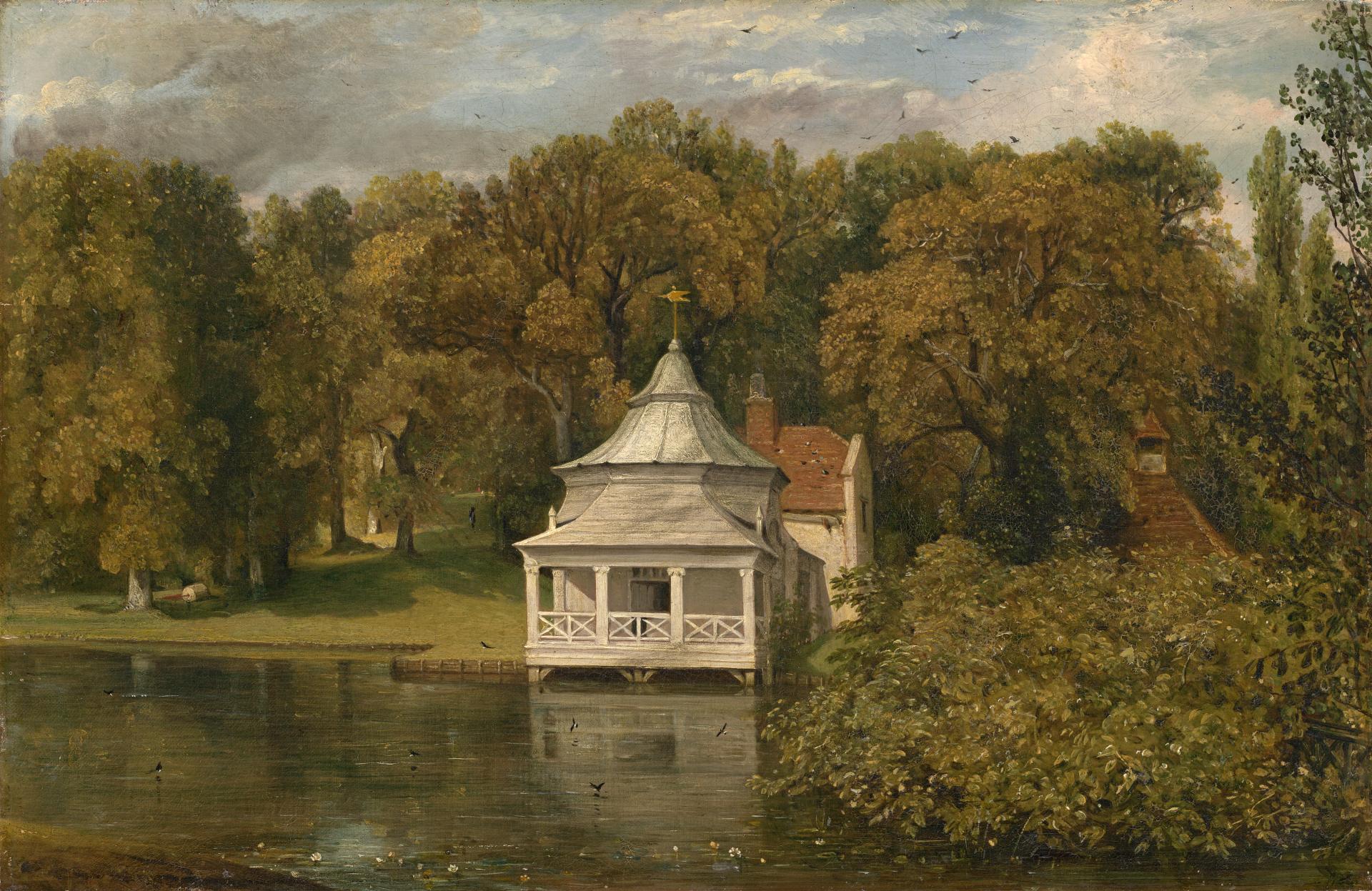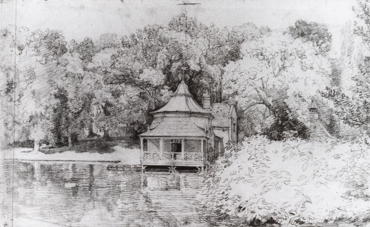 It is understandable that a favourite retreat like the little Chinese fishing pavilion should be selected by the Rebows as a fit subject for Constable’s brush. The finished painting, however, gives little indication of the sociable pastimes enjoyed at this site. Instead, the artist is more interested in the dramatic contrast between what Girouard calls the ‘exquisite and enchanting artificiality’ of the white oriental pavilion,24Girouard, p. 1041. During 1816 Constable depicted on more than one occasion a picturesque building flanked by trees, as, for example, in the drawing The Octagonal House, Putney Heath (private collection) (see Reynolds, Early Paintings and Drawings, text vol., no. 16.26, p. 220; plate vol., pl. 1288). and the rich tones of the surrounding English woodland. The closely observed details (the lilies on the still waters, the skimming swallows) and the play of light across the scene convey not only the season, but the time of day: a late summer’s afternoon. This careful naturalism, which also infuses the Wivenhoe Park picture, reflects one of the principles of Constable’s art, which he would later describe as the ‘chiar’oscuro of nature’, meaning both ‘the influence of light and shadow upon Landscape’, and the use of these elements as an expressive device to convey ‘the day, the hour, the sunshine and the shade’.25Constable, quoted in A. Shirley, The Published Mezzotints of John Constable, R.A. (1930), cited in I. Fleming-Williams, Constable and His Drawings, London, 1990, p. 111.