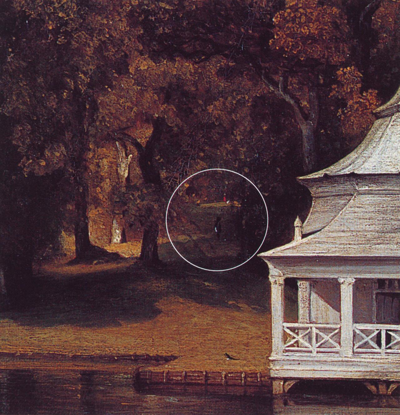 The artist also used variations of tone to bring into prominence certain features, while other aspects of the composition remain partly concealed.26Fleming-Williams, p. 111, suggests that this treatment of detail mimics actual visual experience: ‘[P]arts are seen at a glance, others do not initially register’. Like its companion picture, Constable’s depiction of the fishing house at Alresford Hall demands that the viewer take some time to become ‘acquainted with the scene’. Thus, while some forms (such as the white Chinese Temple against the dark woods, or the sunlit grass and lawn roller) stand out strongly, other forms (like the darker roof of the ancient dovecote or the bridge railing in the right foreground) require further study before they come into focus. This is certainly the case with the two small figures standing on the path between the trees leading down to the fishing pavilion, but these shadowy human presences should not be dismissed too readily (fig. 4). If one compares Constable’s finished picture with its pencil preparatory study (Royal Cornwall Museum, Truro) (fig. 5),27 See Reynolds, Early Paintings and Drawings, text vol., no. 16.29, p. 221. it can be seen that the artist subtly ‘opened up’ the pathway in the painting, using dappled light to draw the viewer’s eye between the trees, so that one encounters first the dark figure and then the more distant figure in red.