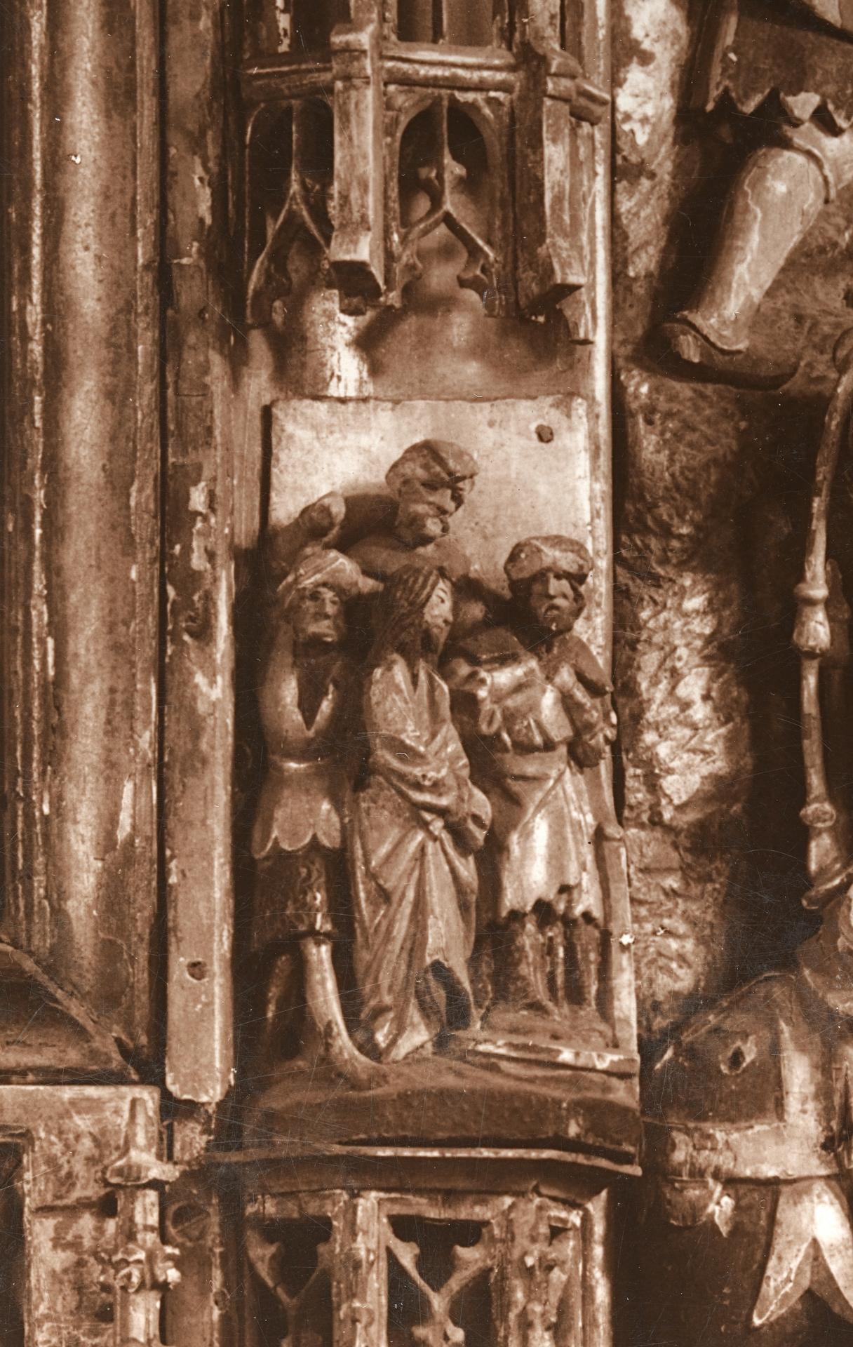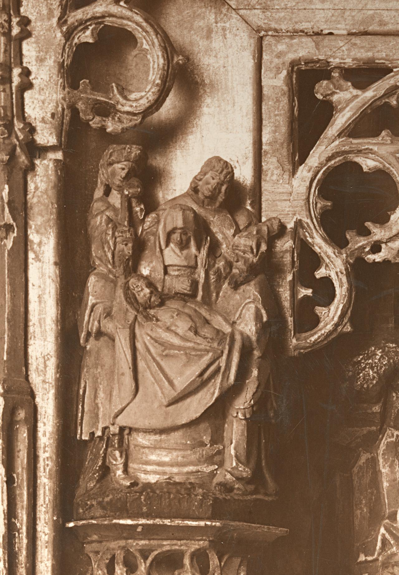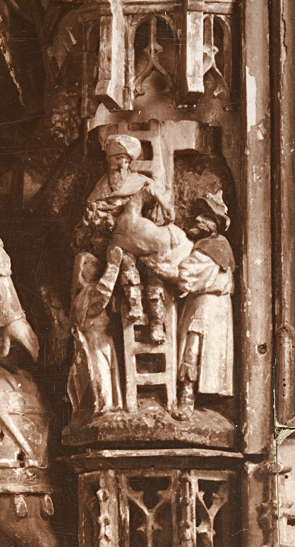 Writing on the painted wings in the catalogue to the exhibition of the altarpiece in Antwerp and Victoria, Perier-D’ieteren concludes that it is an ‘eclectic work’ and that its execution is of ‘secondary quality’! By showing certain analogies with representations from the Häverö and Hökuvud altarpieces, the author infers that this altarpiece was ‘put together’ in a workshop from a repertory of available representations. Although one may agree that the painted panels are of ‘secondary quality’.2 C. Pierier-D’ieteren, Catalogue of the Exhibition of the Antwerp Altarpiece in Antwerp and National Gallery of Victoria, ASLK, 1983, p. 108. the carving of the figures shows ingenuity and the compositional devices give strong impact to the various scenes. Moreover, a definite iconographical scheme unites both the exterior and the interior: namely the eucharist, its institution and its two aspects of the Real Presence and the Sacrifice.