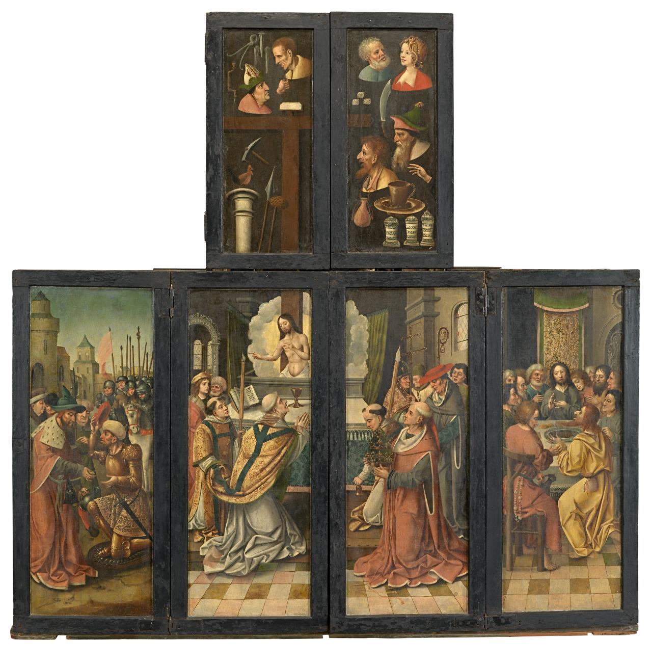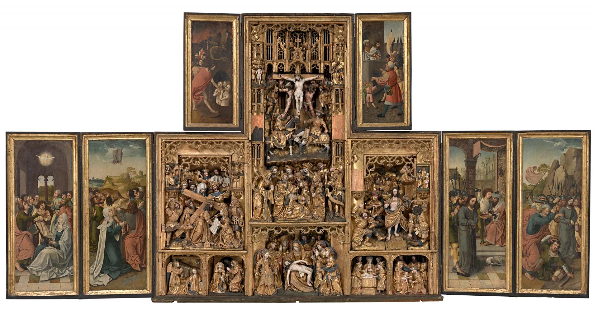 According to tradition, the Antwerp altarpiece – a didactic edifice for the contemplation of the faithful – belonged to a Beguine Convent at Tongres. The van der Straten family acquired the altarpiece before 1871, housing it in the chapel of their Chateau at Ponthoz. Unfortunately, sometime before 1880, the original order of the painted panels was tampered with, probably when they were transferred from oak to plywood supports; and three small sculptured groups representing Christ before Herod, Descent from the Cross and Entombment have been lost since its acquisition by the Gallery in 1935.