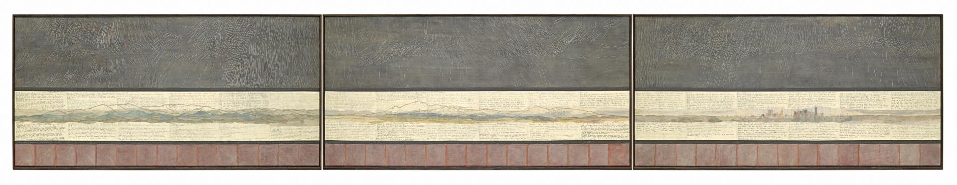 taped off the panels into three sections. Dark sky, light panorama and below that the earth section with the tribal names. So the lower section (boxes) was completely eliminated. Just the canvas divided into three sections to make the spatial effect right. Then the idea of lead strips to divide off the sections where the tape had been on the panels – decided to stamp on the area names of the city. So now there is a time sequence built in and I have got away from the base boxes of the other two pictures.31 Maddock, Journal, 3 September 1989.