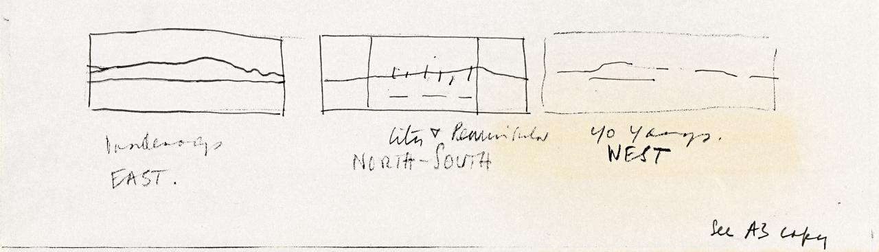 cloud layers coming in from the west – very dark (blue-black) towards the peninsula. Would have been a good day to draw from Maribyrnong. It’s hard to wind down and stop thinking about the picture. Made some drawings of the cloud layers, trying to get the form. Very windy – had plenty of time to watch the passage of the clouds.35 ibid., 7 July 1989.