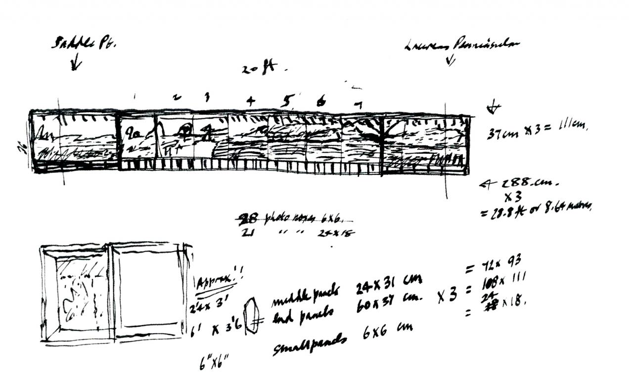 The third horizontal band in the composition of the seven panels contains twenty-one framed cibachrome photographs. In an early concept of the picture, these were to consist of photographs taken at the same time and place as the landscape was drawn.