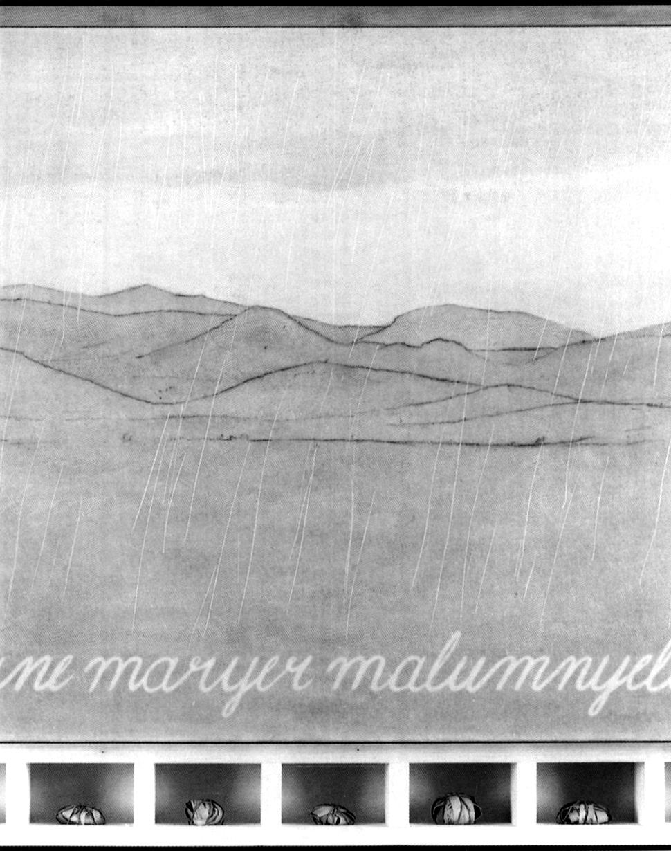 Finally the panels, now reduced to four, contained all that remained of the bands of people whose land is depicted: the landscape, the language and the artefacts. I had decided to include a single line of words across the panels.23 mienteina poimena poymalangta teekerloner: numrarerernarne maruer malumnyella trowutta loantennina: mina teanerpare myyenna teroona parrawemmenne meemurrer peoora mienteina; Plomley, Word-List. They make up a translatable and meaningful script to me, but because I wish them to be read in the original, they are to remain untranslated, for ‘when not understood, words appear in their greatest physicality, dense, concrete and singular’,24 Stephan Fredman, Not Understanding, 1983. and here they represent more poignantly what has been lost.