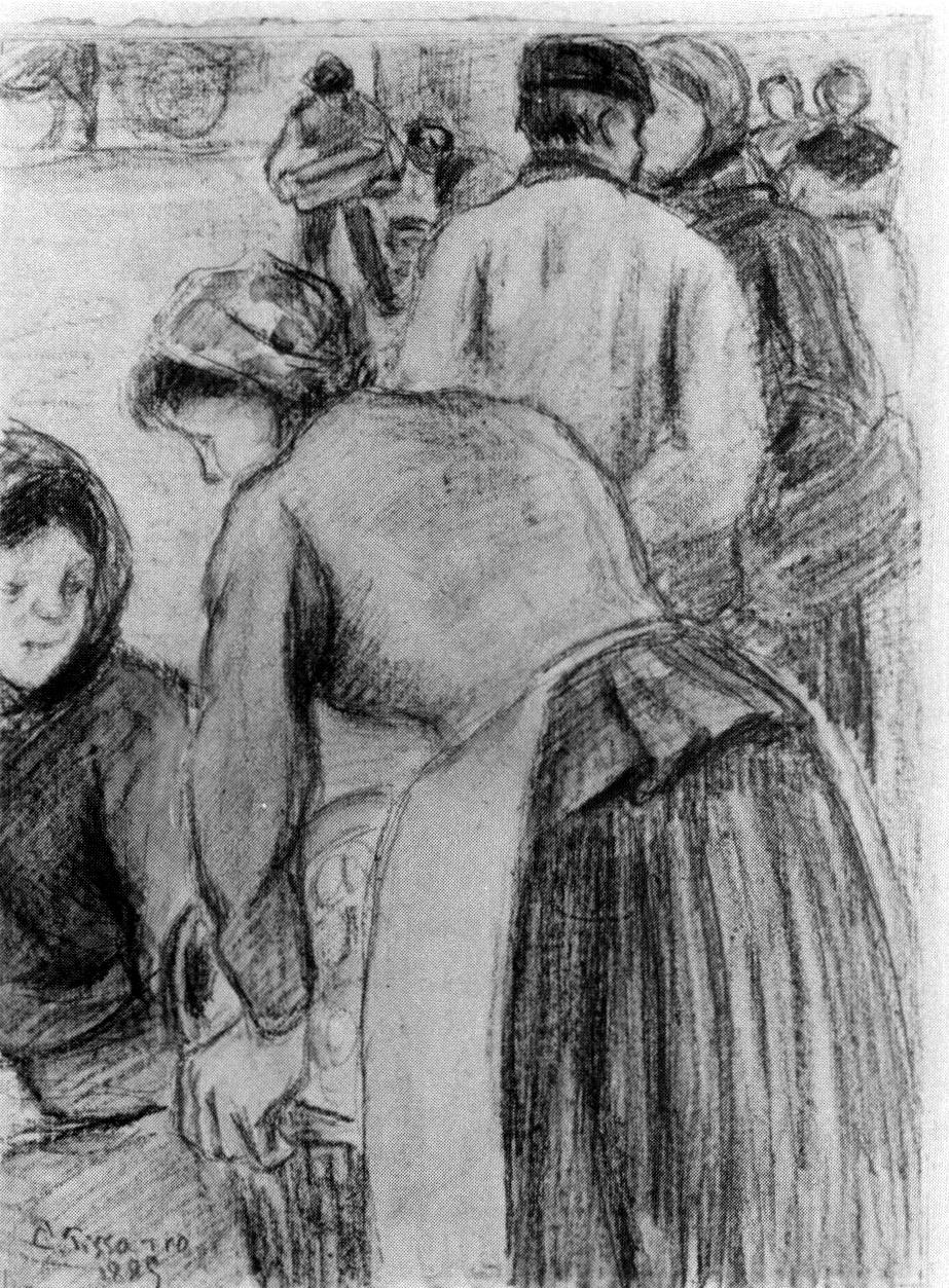 Pissarro’s representations of markets, therefore, reveal a surprising number of facets of his art, They are, first of all, the most significant figure compositions in the whole of his extensive oeuvre and the subject matter itself brought to the surface the social and political tensions that are evident in his correspondence and underlie much of his work. The concentration on the human figure was not a totally new development, but it is a fresh emphasis and in order to achieve such powerful compositions as Le marché à la volaille, Gisors (fig. 4) or Le marché à Pontoise (fig. 13) Pissarro undertook further study of the human figure. This concern can be clearly seen in the number of figure studies, some of them large in scale and of outstanding quality, undertaken during the early 1880s. The drawing that has recently been acquired for the National Gallery of Victoria is a pertinent and beautiful example of this important moment in Pissarro’s development.