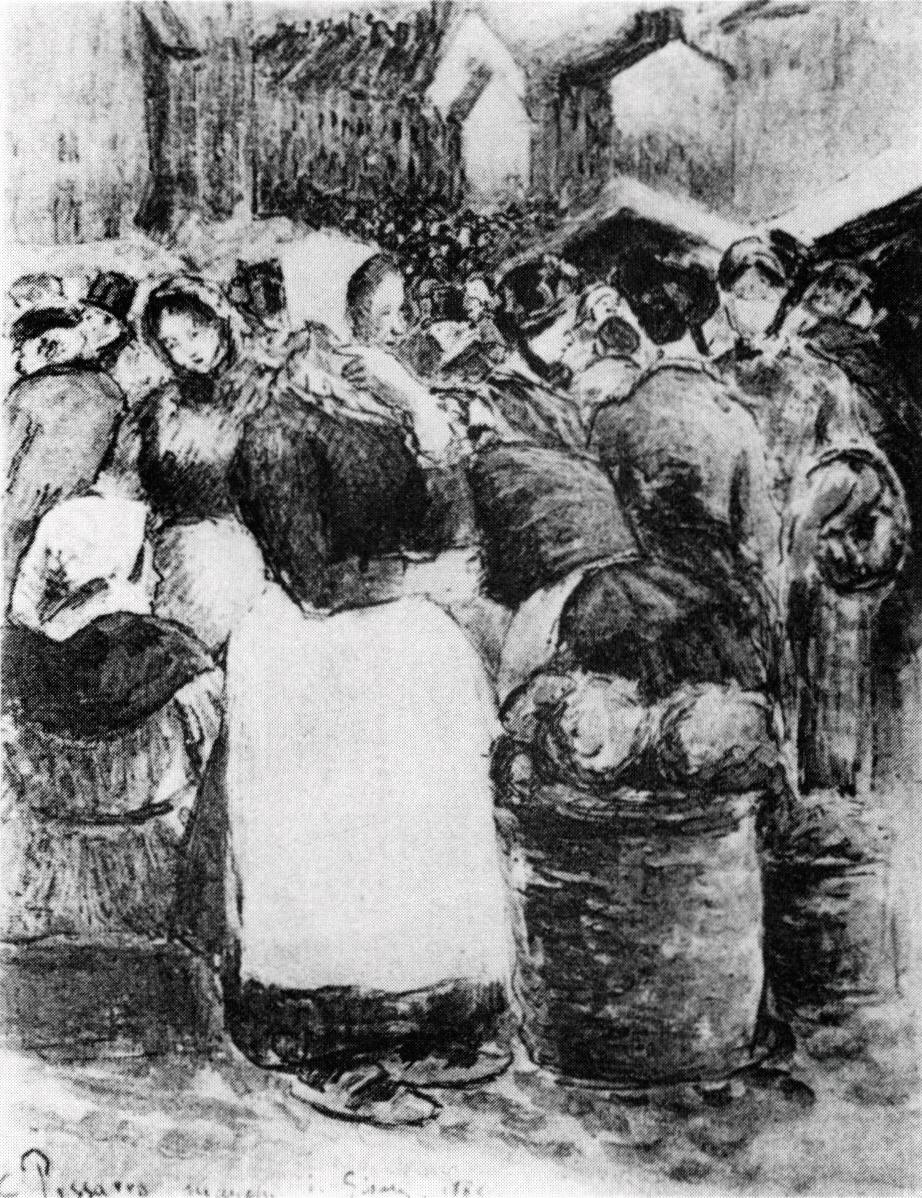 32 This was most probably the purpose of the preparatory drawing in Oxford (Brettell & Lloyd, no. 168E exhibited Pissarro 1980–1, no. 124). A similar concern, quite apart from descriptive detail, may have been the purpose of two early drawings of markets made when Pissarro was in Caracas: a sheet from a sketchbook in a private collection, Caracas (reprod. Brettell & Lloyd, p. 46, fig. 14) and a sheet once in the collection of Frederick Edwin Church preserved in his house at Olana, New York, on the Hudson River (inv. 1982.294).