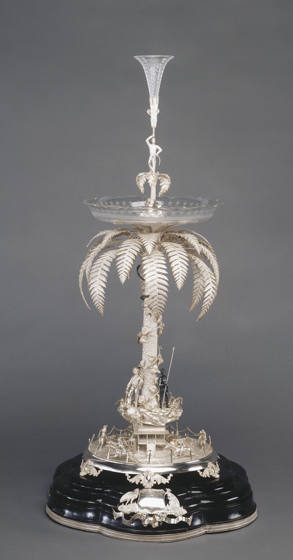 For The Mayor’s Cup, made to be presented at the December 1879 meeting of the Australian Jockey Club, Kerr devised a trophy in the form of a tree-fern epergne. Epergnes of this kind were made by a number of makers, but this one is unusually large and is enriched with allegorical figures and an extraordinary miniature racecourse. Five carousel-like horses and their riders are engaged in what seems to be an eternal circuit of the base of the epergne. The detail is remarkable and includes a marquee, a judge’s booth and a grandstand full of spectators. The Mayor’s Cup was exhibited on Kerr’s stand at the 1879 Sydney International Exhibition, where it attracted a great deal of attention.