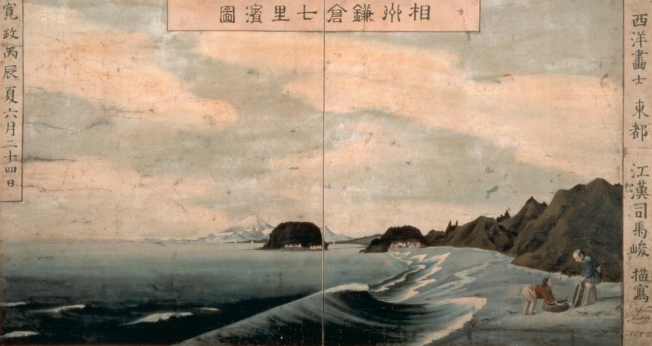 22 The incorporation of blue into ranga paintings meant that ranga provided a model for Hokusai to explore the possibilities of describing depth beyond linear perspective. When the Edo writer Takizawa Bakin saw a ranga image projected by a camera obscura in Osaka in 1802, among other things he was struck by the blueness of the sky. Shiba Kōkan’s ranga works, such as Shichirigahama, similarly placed emphasis on vast expanses of blue in sky as well as water.