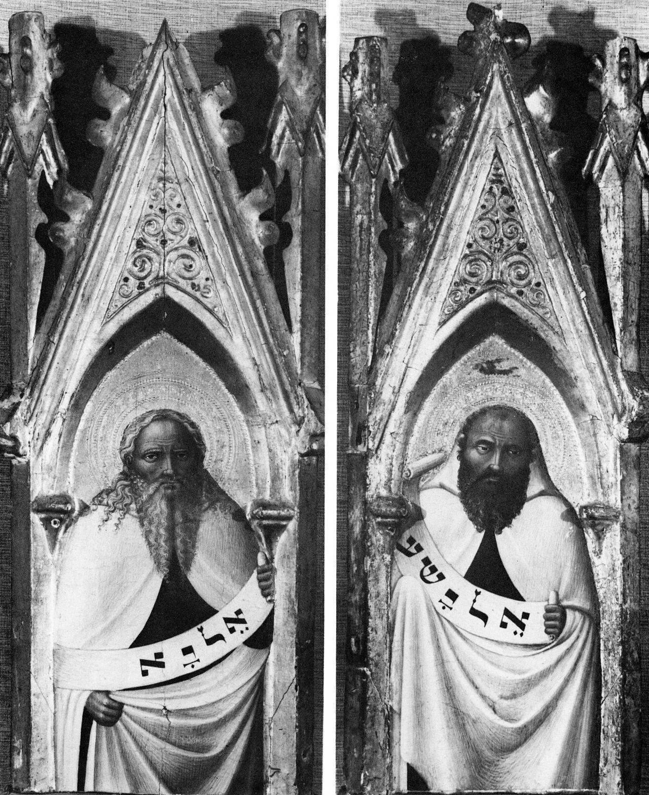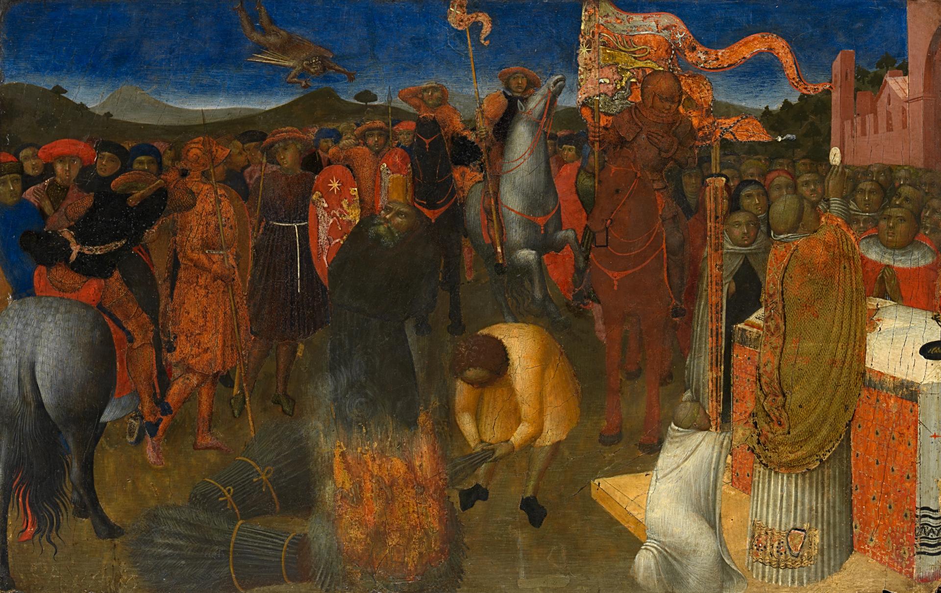 As a result of all these facts, a possible logical explanation for the original provenance of the Arte della Lana altarpiece would be the church of Santa Maria del Carmine in Siena. The Carmelite iconography of the pinnacle figures of the prophets Elijah and Elisha (Figs 2 and 3) (who are also included in Pietro Lorenzetti’s famous 1329 painting for the same church) and the Carmelite monks in the predella scenes is very clear. The burning of Jan Hus (amidst the banners and shields which contain the coat-of-arms of the Arte della Lana), the subject of the Melbourne painting, is also a visual representation of the victory of the Carmelites in their strong fight against the heresy regarding the doctrine of transubstantiation. In fact, kneeling Carmelite monks are seen in the right foreground of the Melbourne painting. As already mentioned, Scapecchi has pointed out the very strong historical and spiritual ties among the Carmelites of Siena, the Arte della Lana of Siena, and the Festa del Corpus Domini (the mystery of Corpus Domini was actually the subject of the central panel of the Arte della Lana altarpiece). In this sense, the Melbourne painting, and the altarpiece as a whole, is nothing less than a complete visual summary and representation of these historical and spiritual bonds.