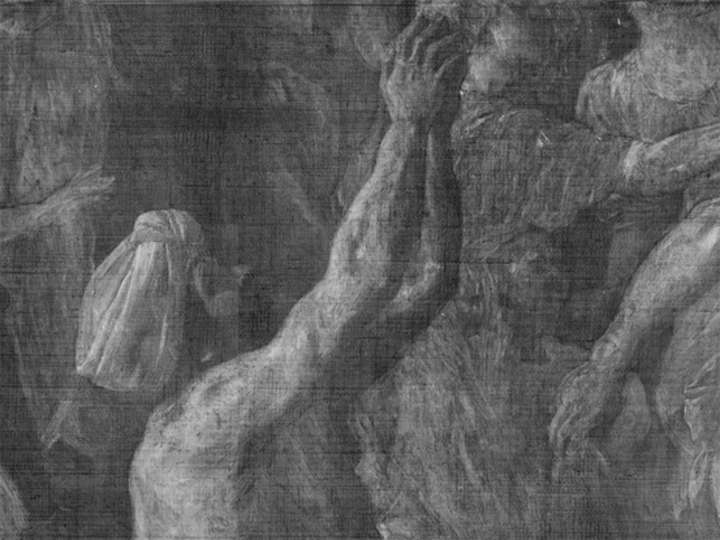 Now we are able to recognize the image of the painting and can make some assessment about the artist’s technique. The fact that the radiograph corresponds with the painting as we normally view it tells us that Poussin did not make wholesale changes to the painting while he was at work.