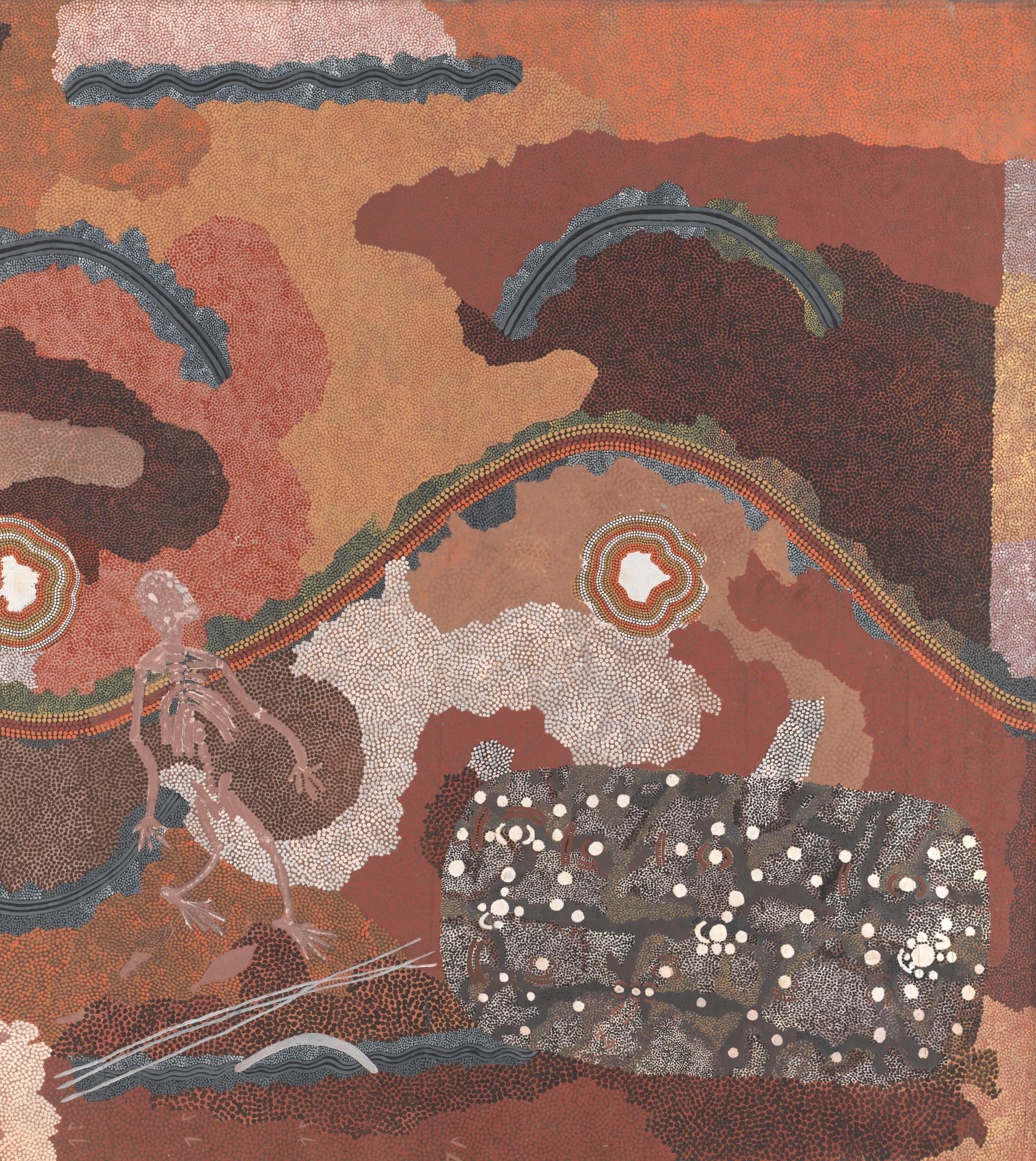 Unique to the work, which reads as a self-portrait, Tim Leura includes copies of three paintings done for Bardon in 1972, the Yam spirit Dreaming, the Old man’s Dreaming and the Sun and Moon Dreaming. All three paintings express Tim Leura’s close relationship to Bardon and comment self-consciously on his position within the history of the Papunya Tula movement, creating ‘mere toys for childish white people’.16 Bardon, p. 46. The haunting death-spirit figure, an ethereal skeleton that stalks and shadows the artist’s homelands, reflects Tim Leura’s mounting despair towards the end of his life, which ended brokenly in 1984. As Bardon notes: