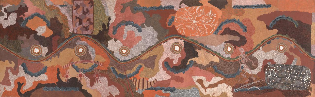 Tim Leura’s imagination is visible in the build-up of … formal effects that elaborate upon (and change) the foundational symmetry of the main journey lines … (painted carefully in dot trails by Clifford Possum) [and which] provide an inaugural symmetry and arterial movement along the huge, seven-metre axis of the painting.15 Murphy, p. 62.