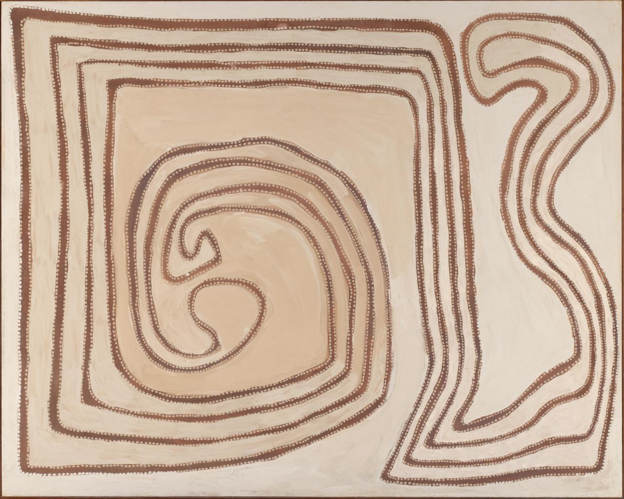 The culmination of Tim Leura’s painting life was probably his Napperby death spirit Dreaming, completed in 1980. It is an extraordinary work because it is the first painting in which a Western Desert artist stands aside from his tribal context and comments, quite self-consciously, on his art, his Dreamings and himself … The Great Painting is a savage and brooding repudiation by him of his white masters. He apparently felt that his life’s journey, shown in the huge sinuous line holding the Dreaming ‘windows’ in equipoise, was a rejection of white man’s pretensions. The death figure in the painting is Tim’s perception of himself in his own social context.17 ibid.