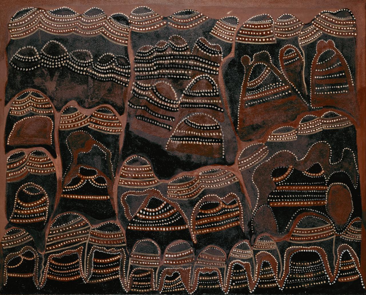 Britten’s painting of Purnululu (Bungle Bungle Ranges) captures the topography of the East Kimberley, full of rocky protrusions and twisted hills that are depicted in profile as conical shapes, not as flat circles characteristic of Western Desert iconography. Britten’s painting refers to the Dreaming story of Gidgunji, the chicken hawk who opened his mouth and tried to sing out: everything was turned over and he was transformed into stone. This story of Gidgunji’s transformation is manifest in the artist’s singular vision of the Bungle Bungles in which lines of bell-shaped rocks rise out of a sombre, darkened ground. It is a massive, brooding work, painted in sepia and black earth pigments that are mixed with gum from the bloodwood tree, producing a slight surface shine. The stratified rocks are set at diverse angles to each other, in a composition of twisting movement. Britten has incised the dark, resinous surface with zigzag and linear markings reminiscent of the engraving of artefacts and boab nuts in the Kimberley region. The rock forms also bear dotted designs, which derive from body paintings, showing that country and law are intertwined in the mind of the artist.