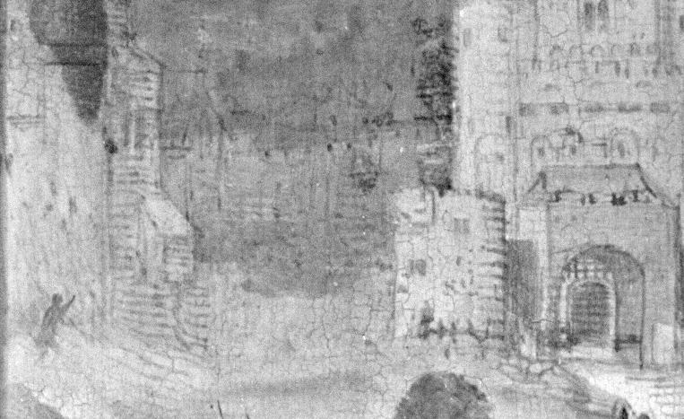 The panel was found to have been prepared with a ground of chalk and glue. The underdrawing, which was executed with a brush, revealed that there were a number of changes between intention and execution. The architecture of the town in the left background has been simplified from its representation in the underdrawing (figs 18a and 18b), and a figure has been left out. There have been slight shifts in the alignment of Christ’s feet (fig. 19). The underdrawing is handled differently in different areas of the composition, with single hatching being used to represent shadowed areas; the rendering of the figures is tight, while the drawing is loose and less prescriptive in the background. A curious arc of broken lines follows the basic form of the face of the woman supporting Christ’s body (fig. 20).7 Reflectograms used to examine the underdrawing were made by Michael Varcoe-Cocks, with equipment funded through a joint Research Infrastructure and Equipment grant made available to a number of institutional conservation studios, and coordinated through the University of Melbourne.