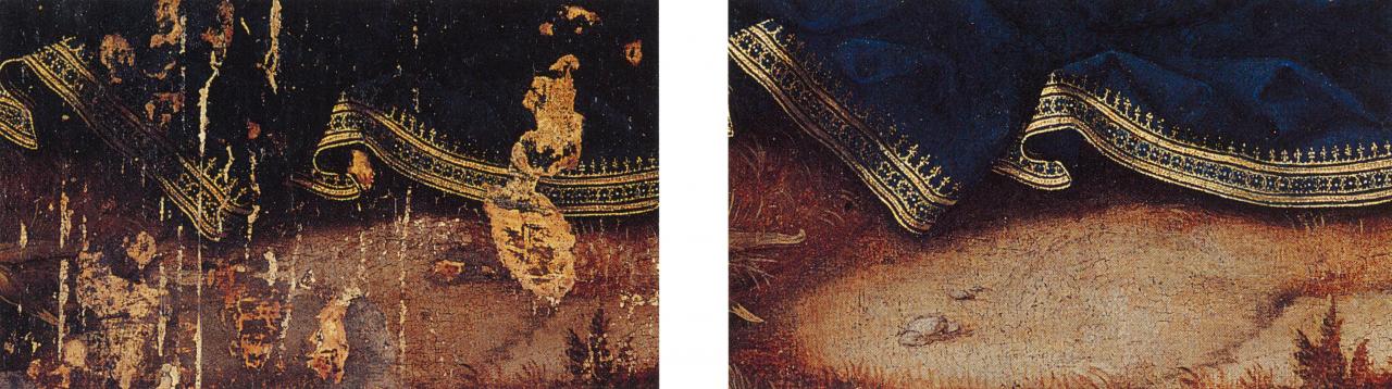 Despite these similarities, and although the two works are directly linked by subject and by the structure of the primary figure group, as well as by the intentions revealed beneath the surface, the Brugge and Melbourne panels are not by the same hand. The Melbourne painter is more precise and complex in his rendering of faces, fleshtones and general detailing. The fabrics are richer in texture, and the colour more strongly orchestrated throughout.