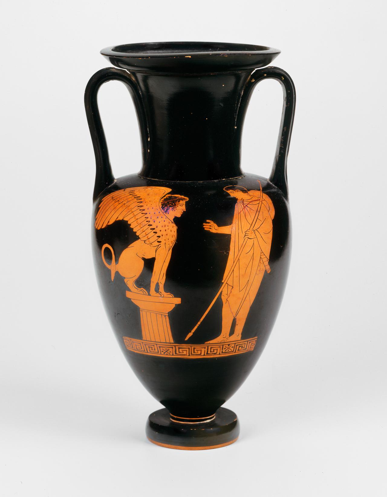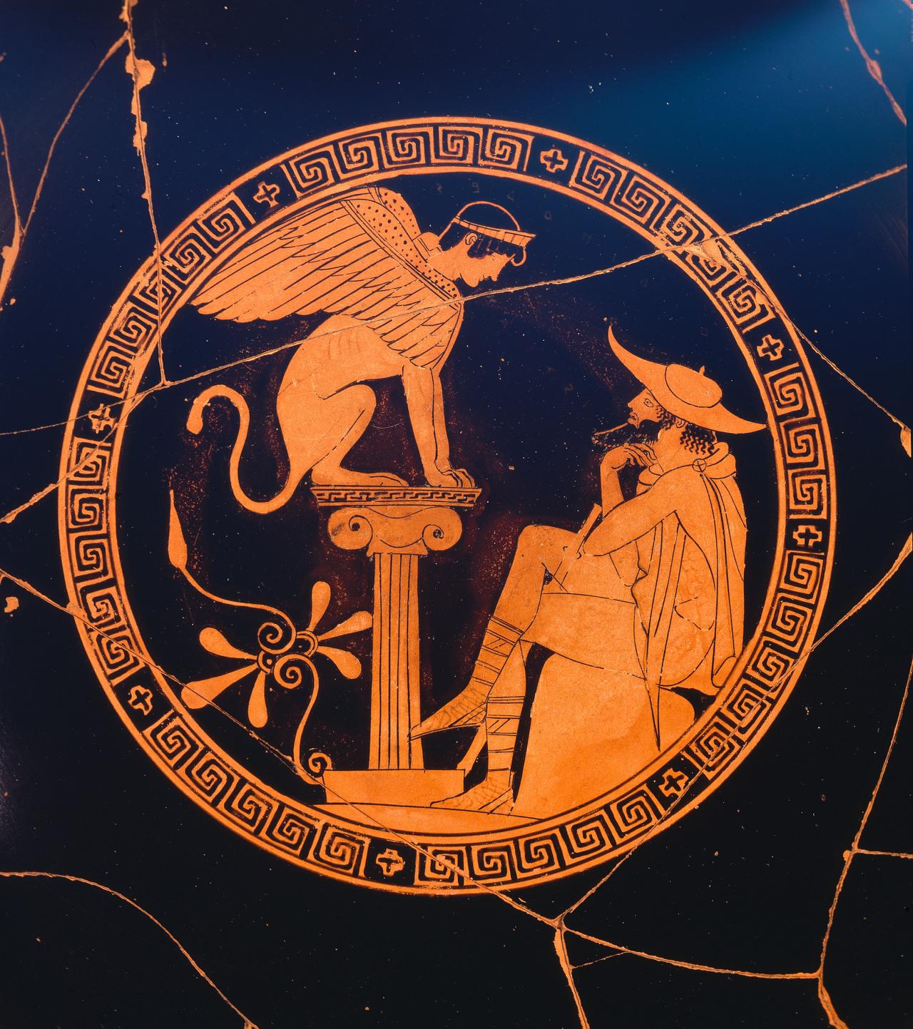 At some stage in his journey, Oedipus confronted the Sphinx and solved the riddle, the answer being Man. The grateful Thebans, now rid of the Sphinx, awarded him the vacant throne and Jocasta as his queen, so the oracle was fulfilled. Sophocles’ tragedy is about Oedipus’ later discovery of what he is and what he has done, but the majority of vase-painters of the fifth century BC, able to abstract only one scene, chose the riddle scene, which encapsulates all that has happened and will happen to Oedipus.