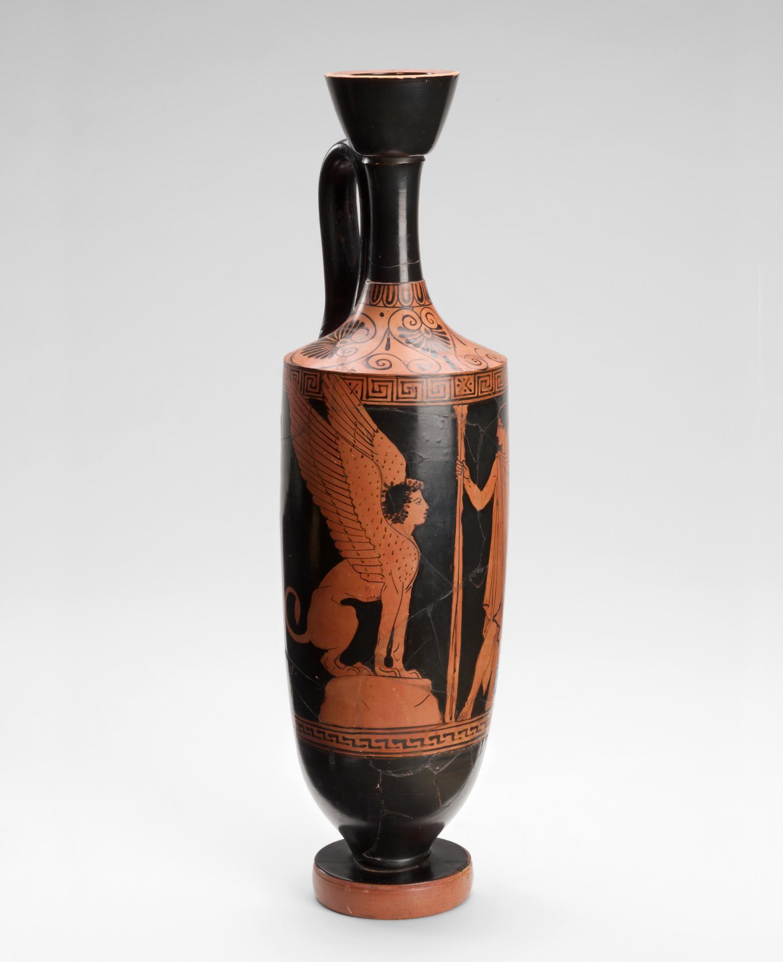 A lekythos is a tall, slender-bodied vessel designed to hold oil.2 In this case the lekythos does not have the false base of those often designed for funerary gifts with a small interior cup holding the precious oil, leaving the rest of the vessel empty. The firing hole, which this would necessitate on the lower body, is not present. So, the owner/purchaser of this vase planned to fill it with a large amount of expensive oil. Oakley has identified the work of ‘Potter A’, who also worked for the Achilles Painter’s probable teacher, the Berlin Painter. (Oakley 1997, p. 73, figs 1–4, demonstrating the ‘gently curving underside’ favoured by this potter). It provides only a narrow field for figurative decoration. The quiet, two-figure composition chosen by the Achilles Painter is most suitable and typical of the ‘sober beauty’ which is the painter’s compositional hallmark.3 Beazley ARV 2, p. 986. The subject is Oedipus solving the riddle posed by the Theban Sphinx (fig. 2). The myth behind this is one of the better-known Greek myths because of Sophocles’ version of it in his tragedy Oedipus Tyrannus, the production of which, however, post-dated this vase. Oedipus had been exposed on the mountainside as a baby by his parents, Laius, king of Thebes, and his mother, Jocasta, as any son of theirs was fated to kill his father and marry his mother. The baby was picked up by the shepherd of Polybus, king of Corinth, and brought up as the prince of Corinth until someone cast doubts on his parentage, whereupon he consulted the Delphic oracle. On hearing of his fate, presuming Polybus to be his father, he fled Corinth. On the road he was pushed out of the way by the carriage of Laius and in a fit of rage killed the king. For some time the Theban Sphinx had been ravaging the city of Thebes and posing a riddle which none could answer.