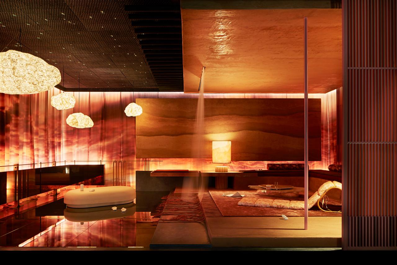 Martyn Thompson Studio’s Atelier installation explores the somewhat old-fashioned notion of the atelier and how in the present, when the line between work and home life is blurred, this type of space takes on a new relevance and becomes an arena for complete creative expression. Similarly, Arent&Pyke reveals that humans are increasingly searching for restorative spaces, expressing the domestic interior as the ultimate manifestation of soulful wellbeing. Richards Stanisich’s installation is wrapped in black gloss tiles edged with a grid of blue light, representing the intangible digital world. Meanwhile, in the centre of the space, living zones are handmade, tactile and textural, their earthy qualities representing our natural needs.