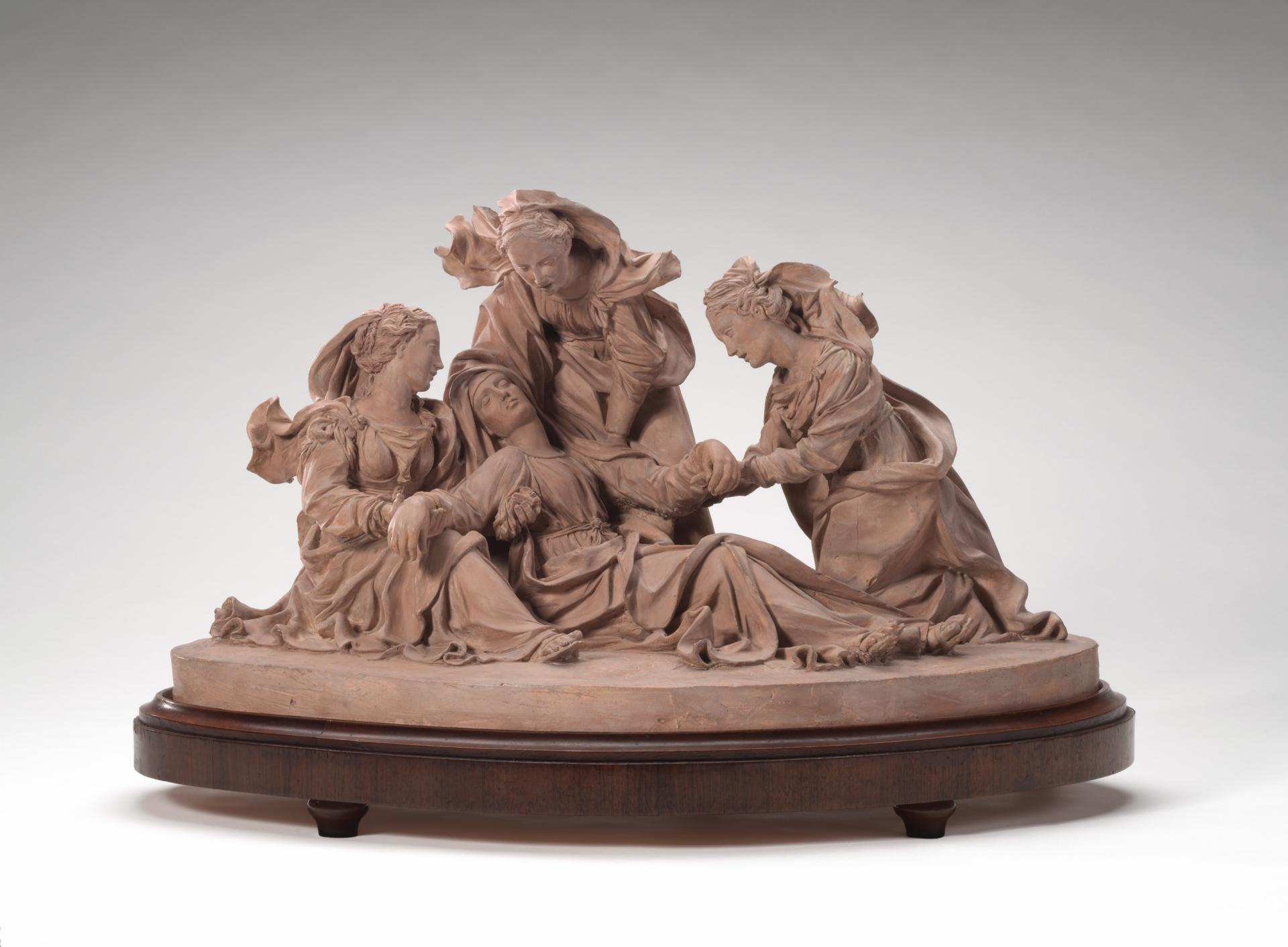 This sculpture and a similar group at the Victoria and Albert Museum, London (the latter work is accepted as fully autograph), are both models for part of Begarelli’s enormous Deposition. Erected in the church of Santa Cecilia, Modena, in 1531, and later moved to the church of San Francesco, this work consists of thirteen life-size figures: four men removing the dead body of Christ from the Cross; the Virgin Mary supported by three holy women at the foot of the Cross; and four attendant saints. In the eighteenth century, tradition – following Lodovico Vedriani’s 1662 biography – held that the great Emilian painter Correggio (c. 1489–1534), as part of an ongoing collaboration with Begarelli, modelled the group of the Virgin and three attending Manes that is found at the base of the Modena Deposition. This theory is generally discounted today, the entire composition being credited to the hand of Begarelli.