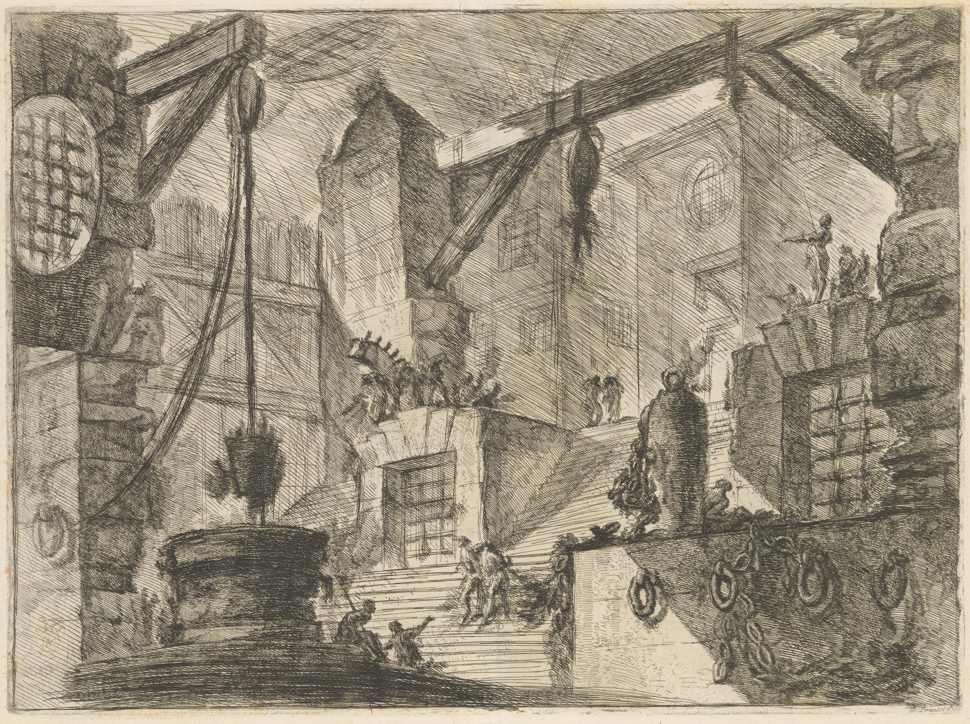 Quando Giovanni Battista Piranesi (1720-78) pubblicò la serie di quattordici incisioni intitolata Carceri d’invenzione nel 1749-50, era un giovane che stava avviando la sua carriera artistica a Roma. Nato a Venezia, Piranesi studiò architettura e scenografia e si trasferì a Roma poco più che ventenne per ricercare e documentare gli edifici antichi della città. Si considerava prima di tutto un architetto, ma ben poche delle sue commissioni architettoniche furono realizzate. La produzione più importante di Piranesi fu quella delle stampe, che produsse in più di mille esemplari nell’arco dei suoi quarant’anni di carriera. La maggior parte di queste rappresentano studi dettagliati di edifici romani e vedute di città, ma l’artista inventó anche paesaggi fantastici, o capricci. Le stampe più sperimentali di Piranesi sono senza dubbio quelle delle Carceri.