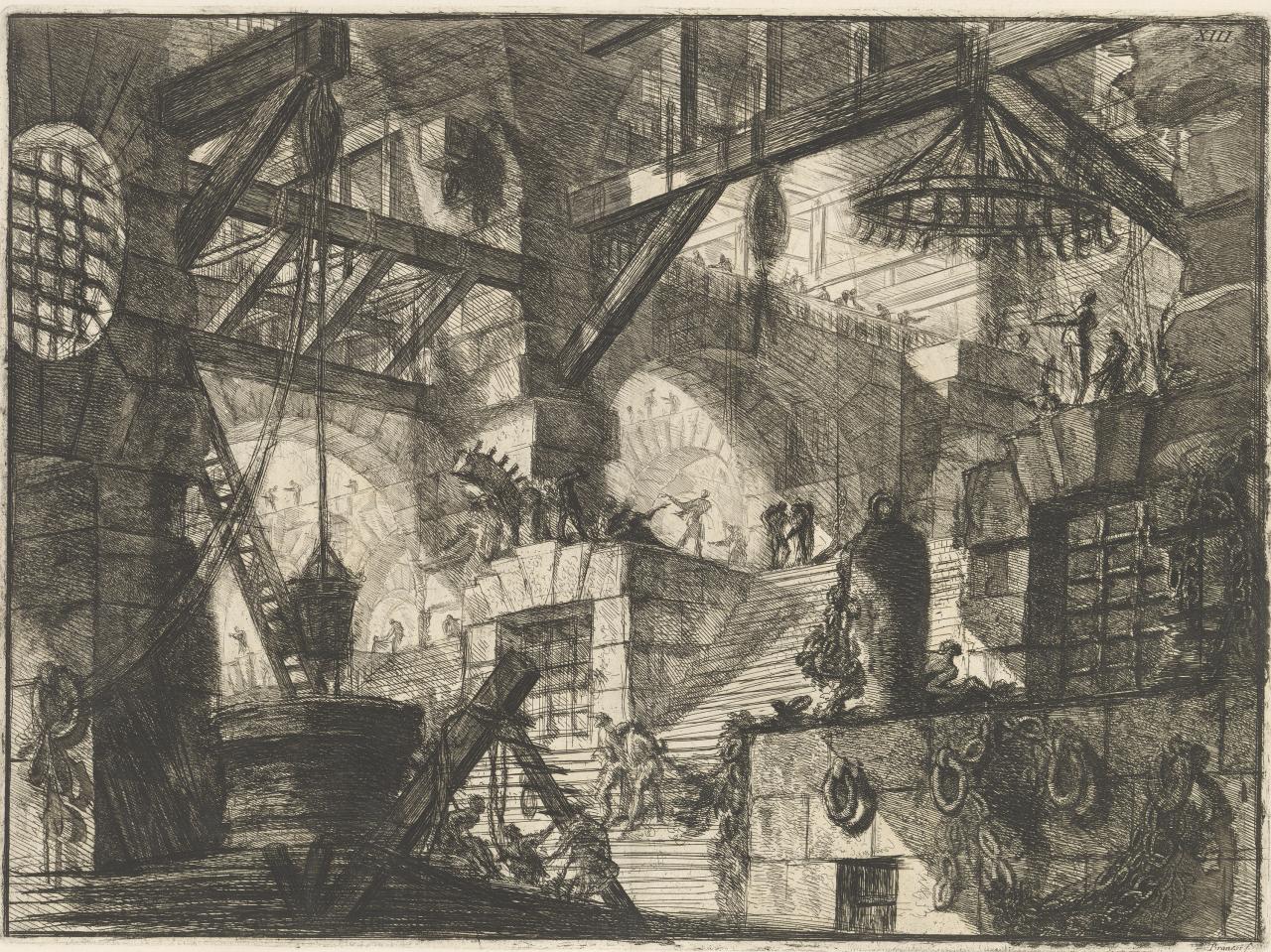 plate XIII from the Invenzioni Capric di Carceri all Acqua Forte (Fanciful images of prisons) series (1749-60), 1st edition published by Giovanni Bouchard, Rome