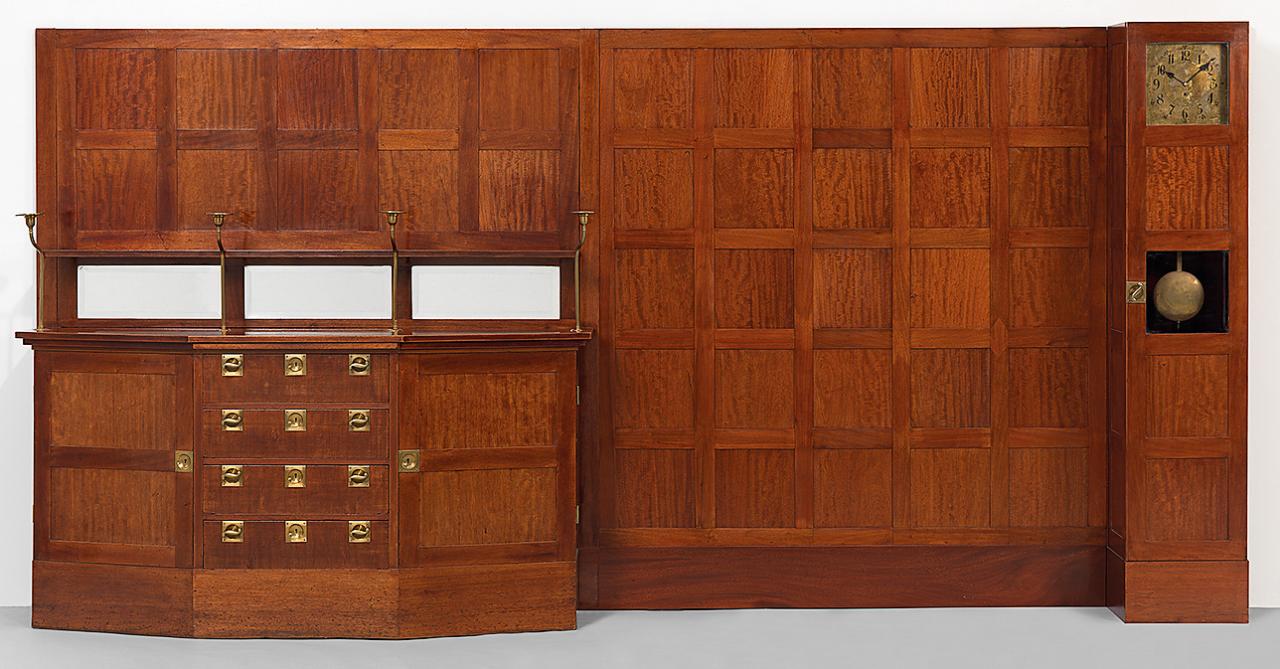 The Langer suite comprises a sideboard, fitted into panelling that includes a long-case clock; a room divider; dining and drawing-room chairs; a desk and chair; a wardrobe and bedroom chairs and cupboards (figs 1-8). Most of this furniture, with the exception of the chairs, was designed by Loos himself specifically for the apartment. The chairs, designed by others, were supplied or recommended by Loos to his clients. The built-in furniture designed by Loos for the dining room best illustrates his restrained and clearly articulated aesthetic, and his interest in providing sturdy, robust furniture designed to last. The two-metre-high mahogany wall panelling is constructed from a square grid design that, in this early example of fitted furniture, offers the convenience of incorporating both a long-case clock and a sideboard into the architecture of the room. The clock case is merely an extension of the panelling pushed out from the wall and repeats the grid motif already established in the panelling. Clear glass replaces two of the timber panels on the clock case, to make the clock face visible, and for the interest of watching the pendulum swing back and forth. (Loos’s fascination with clocks, and displaying their mechanism, is even more apparent in his audacious glass and metal clocks.)15The NGV has one of these in the collection from 1906–07 (D19.a-c-1987). The panelling design on the sideboard is more complex than the clock case, with five equal sections of the wall panelling above it giving to three equal sections on the sideboard below. These are evenly divided between the two flanking cupboards and central drawers below the shelf and the three mirrors above it: all elements in the sideboard are rectangular rather than square. This forms a clear example of where Loos has deliberately disrupted the rhythm of the panelling, for both practical and aesthetic reasons, in order to incorporate the sideboard into the scheme. Rather than forcing all components to fit the same grid, a device used by his contemporary Josef Hoffmann, Loos opted for a freer and more relaxed use of the components.