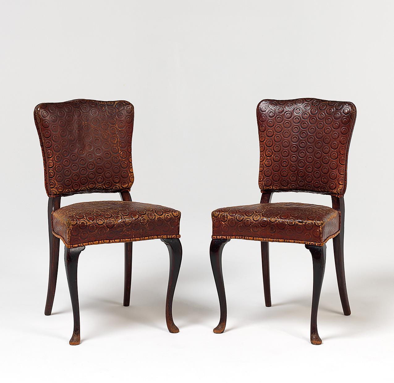 Amid this very architectural framework for the room, Loos included dining chairs with carved wooden backs that were Viennese copies of a late-nineteenth-century English chair in the style of Thomas Chippendale, the great eighteenth-century English cabinetmaker (fig. 3); and Rococo-revival chairs covered in embossed leather (fig. 4). He had used modern copies of early eighteenth-century chairs for the dining furniture of the Leopold Langer apartment of 1901,16See note 10. and indeed had used a similar formula in his earliest domestic interiors from 1899.17Rukschcio & Schachel, p. 420, no. 7.