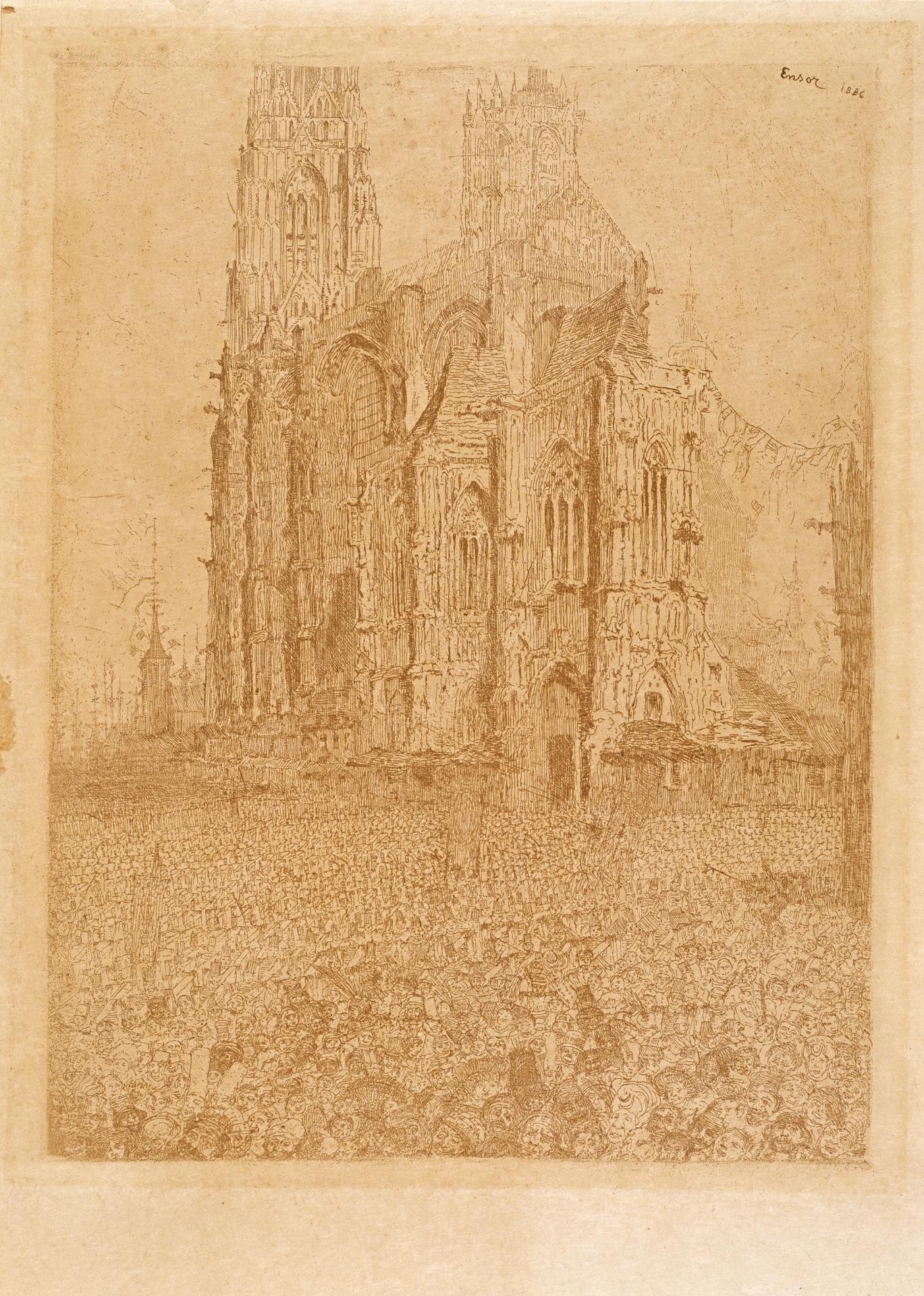 Ensor subtly elaborated the contrast between the cathedral and the masses; with fragile lines and soft shadows he created an exquisitely organised edifice; the crowd, on the other hand, is rendered in dry lines, within which discordant shapes of dark and light convey confusion and disturbance.