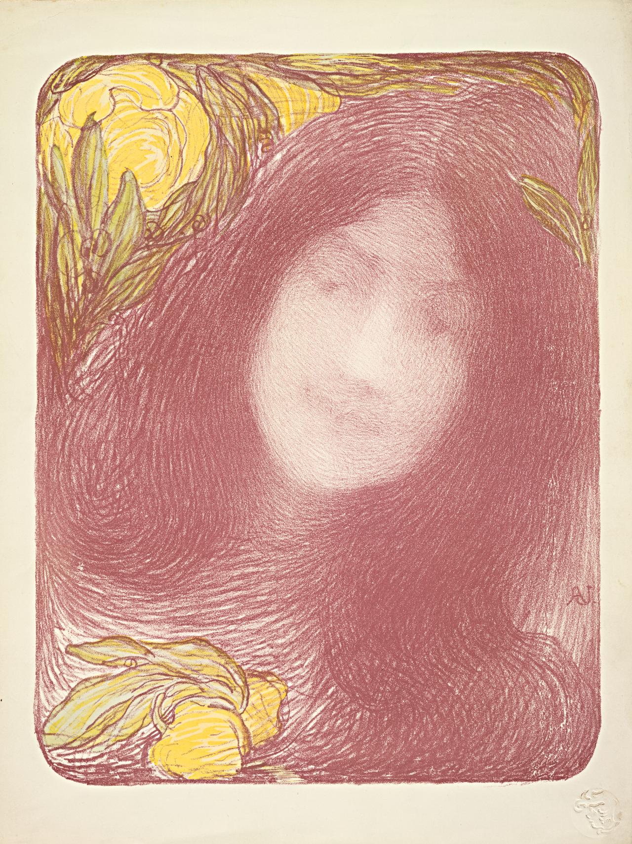 An air of mystery pervades Sous les fleurs (1897)16Sous les fleurs 1897, four-colour lithograph signed with initials in the stone and with the blind stamp of the publisher I’Estampe Moderne, on wove paper, 35 x 27 cm. An impression lent by the Bibliothèque Nationale, Paris, was shown in French Symbolist Painters, Arts Council of Great Britain, Hayward Gallery 1972/3, Cat. pp. 22, 23 and biography, described as a three-colour lithograph. See Ph. Jullian Dreamers of Decadence, London 1971, pp. 116, 126 repr. fig. 64. (fig. 4) where the indistinctness of the face lays emphasis on its Pre-Raphaelite contour, which, obliquely placed, is echoed in the flower shapes, while swirling lines of hair form into an art nouveau pattern. Just as the writers of the ’nineties had used sensuous and unusual colour words to introduce subtle overtones into their prose, thus Aman-Jean contrasted the reddish-purplish-brown of the figure with the pale yellows and greens of the flowers, and the autumnal combination has an insistent, yet faded look symbolic of the transience of youth and beauty, while the play with hair and the dreamy features recall poems by Verlaine such as from the Chanson pour Elles: