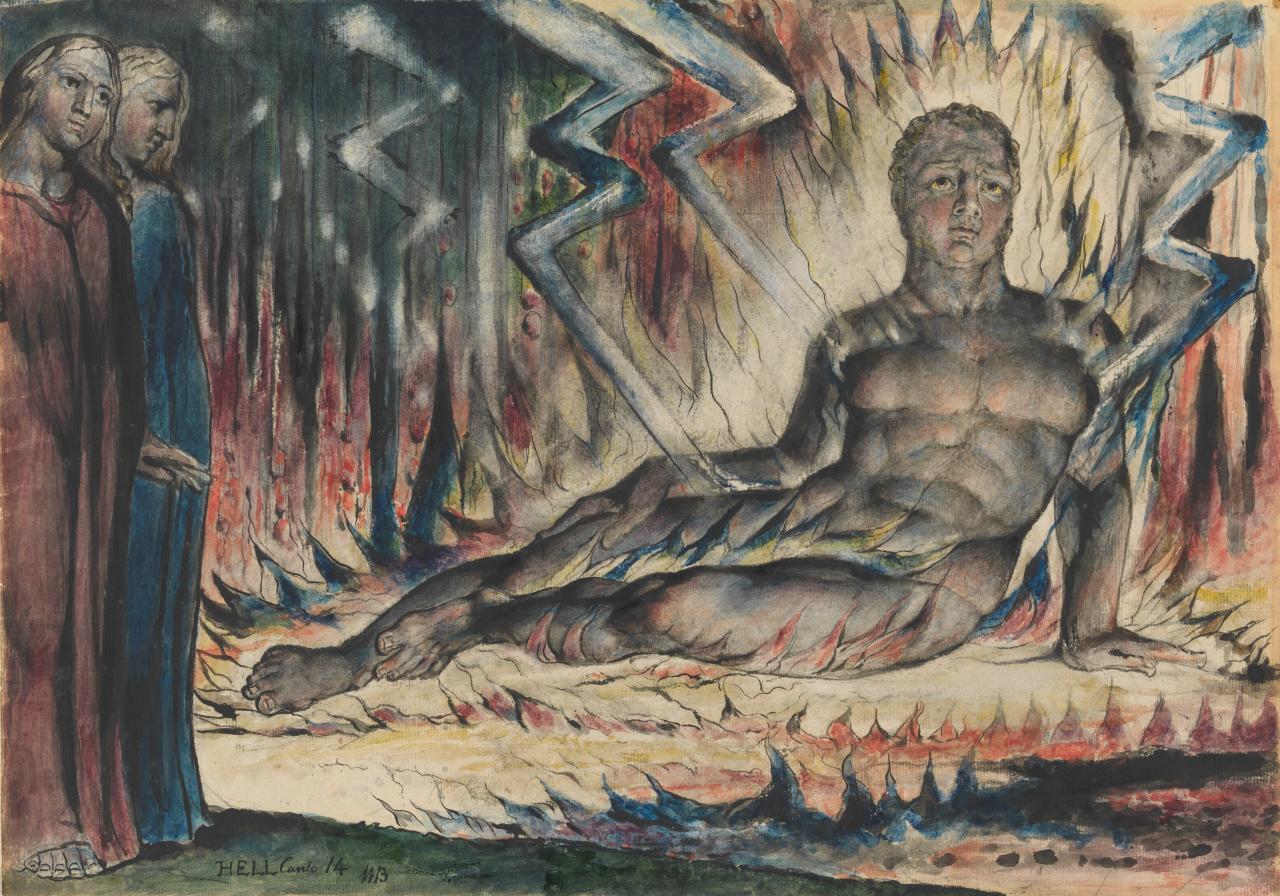 During Blake’s time it was common for a small piece of bread rolled into a ball, or a sponge, to be used to rub and draw the pigment away from the paper’s surface. Within the collection there are examples where the technique has obviously been used to create highlights – such as some of those in the lightning bolts in Capaneus the Blasphemer – while in other works such as The Six-Footed Serpent attacking Agnello dei Brunelleschi pigment removal is more likely to be erasure Blake planned to later repaint, but died before he could do so.