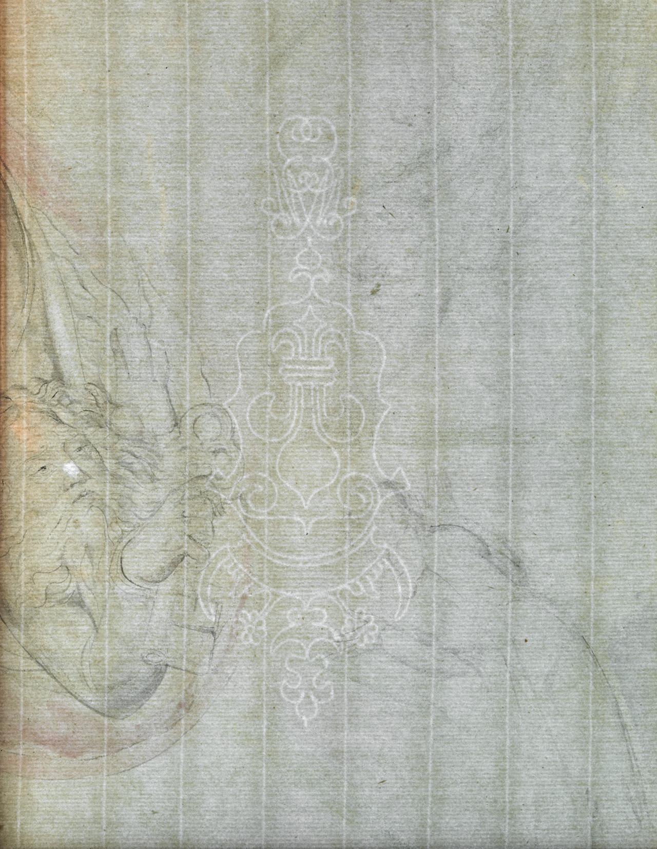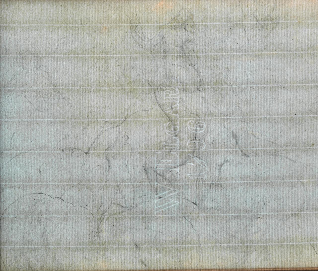 Another technique not noted in previous studies, but observed in one of the most highly finished of the Melbourne works, is scratching out. In rendering the raindrop-like forms descending from the clouds above the head of Antaeus in Antaeus setting down Dante, Blake has used a penknife or similar tool to remove the pigment sitting on the paper surface and some of the underlying paper fibres to create pristine white lines that act as highlights.