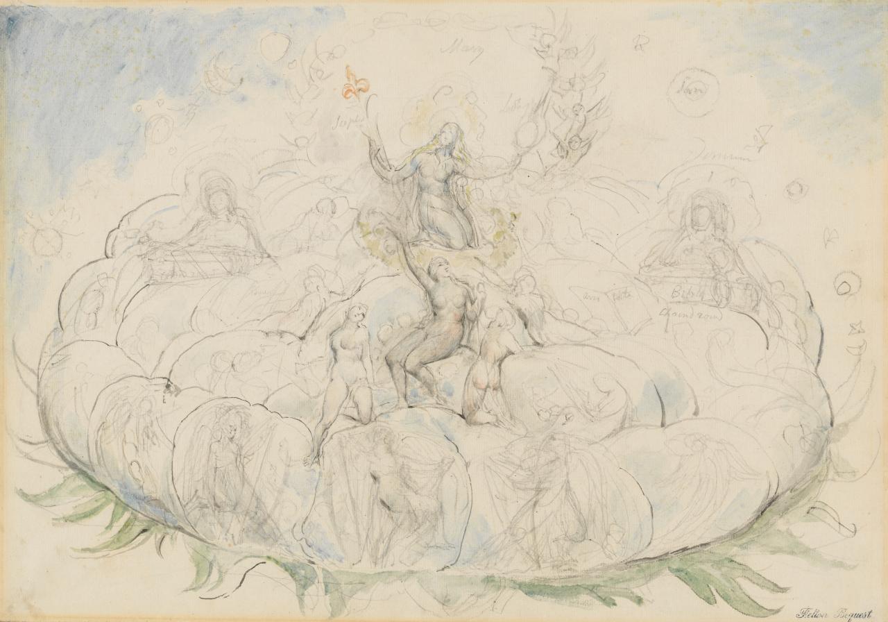 Several works in the collection contain areas of sponging, a technique not noted in previous studies of the series. Sponging is used to soften effects, blend various pigments or to create highlights by removing pigment to reveal the glow of the underlying paper support. In cases where a compositional change is desired, sponging can be used to intentionally erase elements the artist is unhappy with. Having been given a copy of Trattato della Pittura (1821) by John Linnell, Blake was familiar with the teachings of Cennino Cennini, who suggested wetting out an unsatisfactory area of the composition with a large brush steeped in water, then rubbing over it to remove surface fibres so the area could be reworked.29 ibid., p. 43.