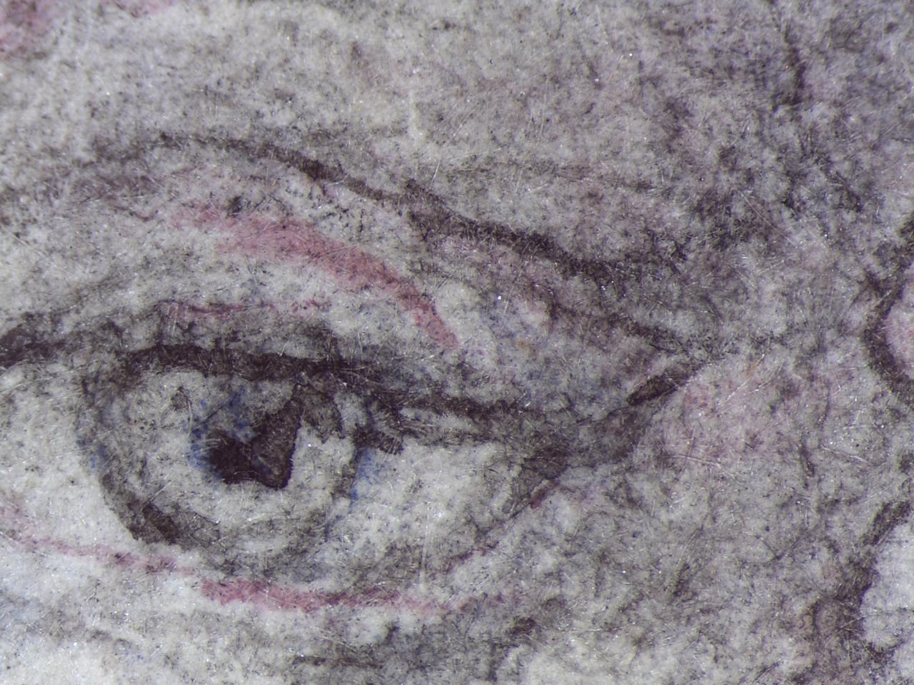 While examining the works under the stereo microscope, it was occasionally possible to gain a sense of the vigour with which Blake had wielded the camel hair brush. Pilling of the surface fibres and localised abrasions could be seen where he had worked vigorously with a loaded brush. His brushwork ranges from broad sweeps of colour to tiny strokes delicately applied with the tip of a fine brush. There are a small number of examples within the most highly finished works that include stippling, an aesthetic Blake would have been familiar with through his previous use of stipple engraving. In Dante adoring Christ, for instance, the face of Christ has been delicately rendered in great detail using tiny brushstrokes. From 1800 Blake worked as a miniature painter, when he would have perfected stippling with brush and aqueous media. The technique was increasingly used by contemporary watercolourists, such as J. M. W. Turner, in the first decades of the nineteenth century.28 Lister, p. 49.